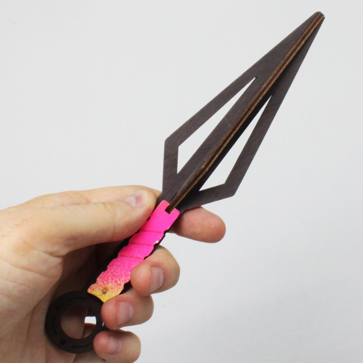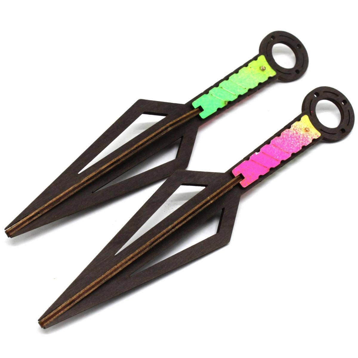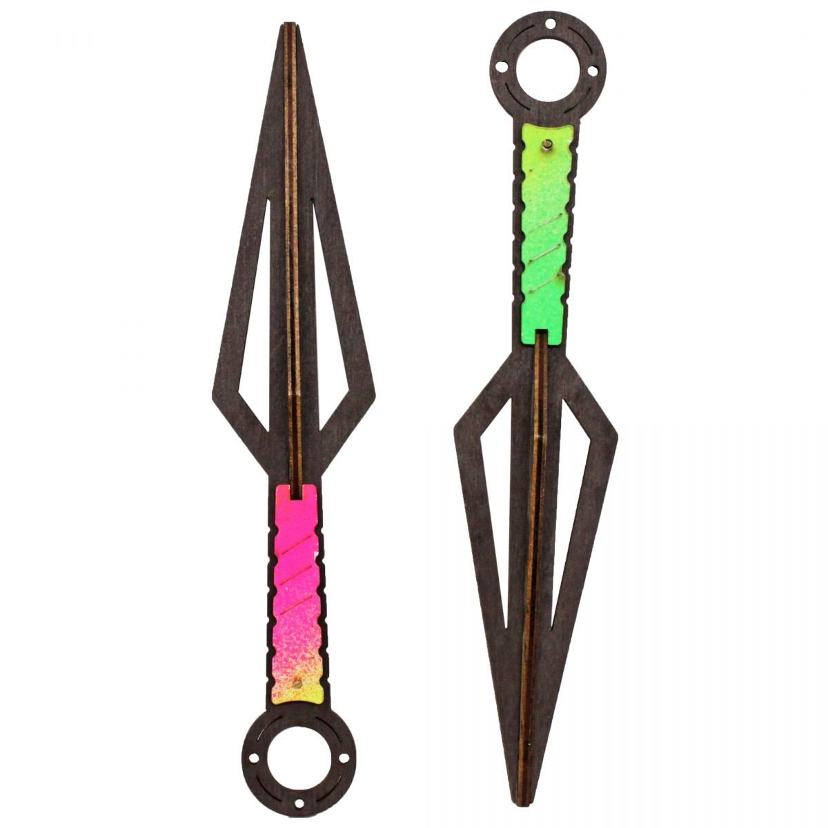Деревʼяний виріб у вигляді японського ножа "Кунай". Зроблений дуже якісно, з високою деталізацією та стійким забарвленням. У наборі два такі ножі. Розмір: 21х3х5 см.