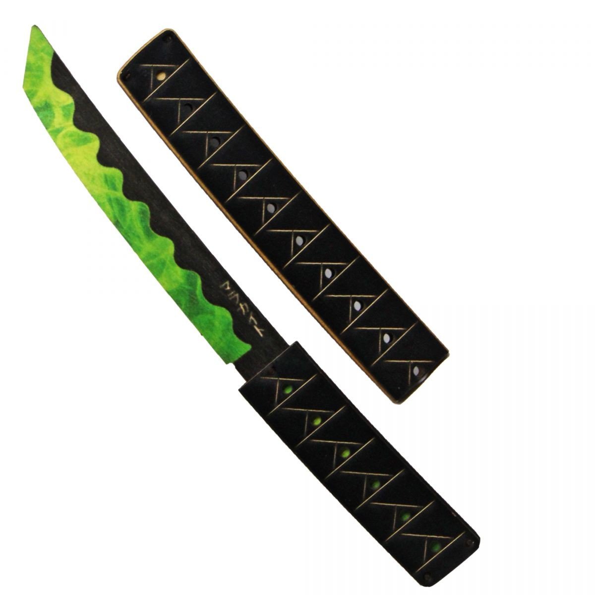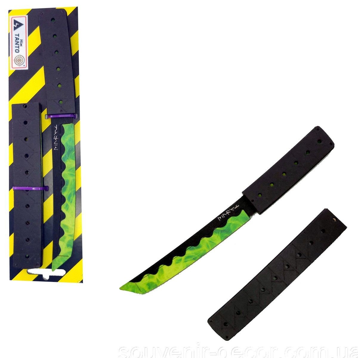 Ніж сувенірний "TANTO МАЛАХІТ". Матеріал: фанера. Довжина ножа – 28 см, ширина ручки – 3 см. Чудовий подарунок-сувенір. Ніж деревʼяний, якісний та міцний. Не заточений, гострі частини закруглені та зашліфовані, повністю безпечний. Лезо та ручка вкриті красивими японськими візерунками. Для дітей віком від 6 років.