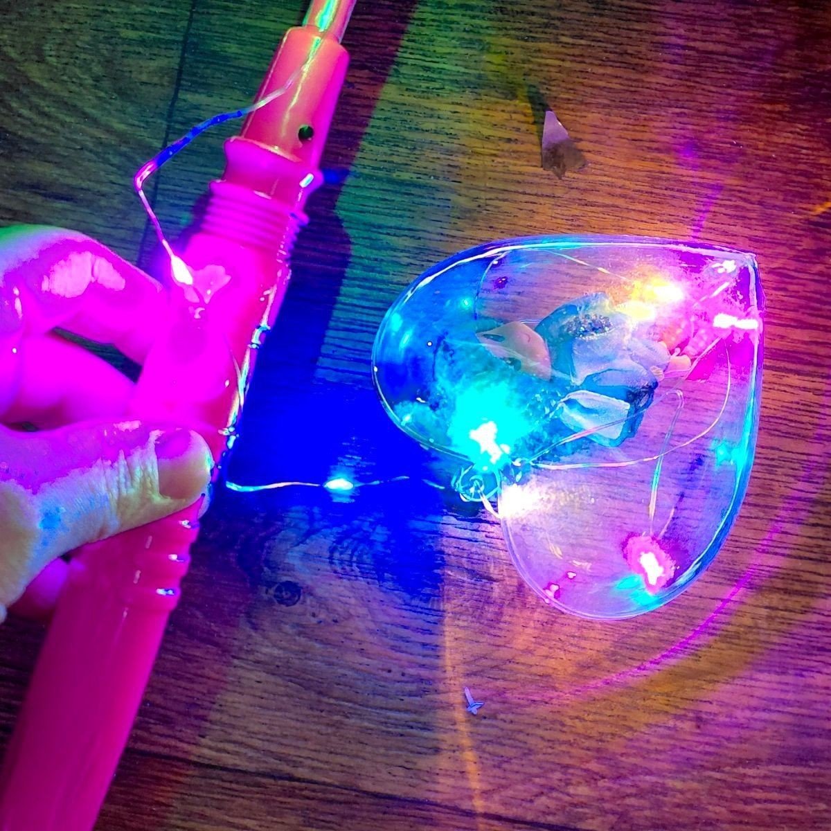 Пластикова паличка, що неодмінно створить святкову атмосферу. Іграшка світиться та має три різні режими підсвітки, створюючи казкову атмосферу. Сердечко можна відкрити, щоб забрати миленький брелок. Виготовлена з якісного та міцного матеріалу. Розмір палички 22х2,5х2,5 см. Розмір сердечка 9х9х5 см.
