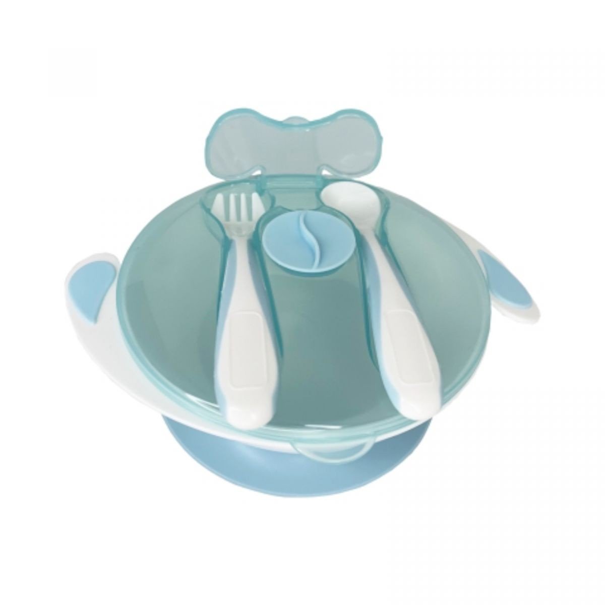 Опис Тарілка на присосці з ложкою та виделкою (БЛАКИТНА)