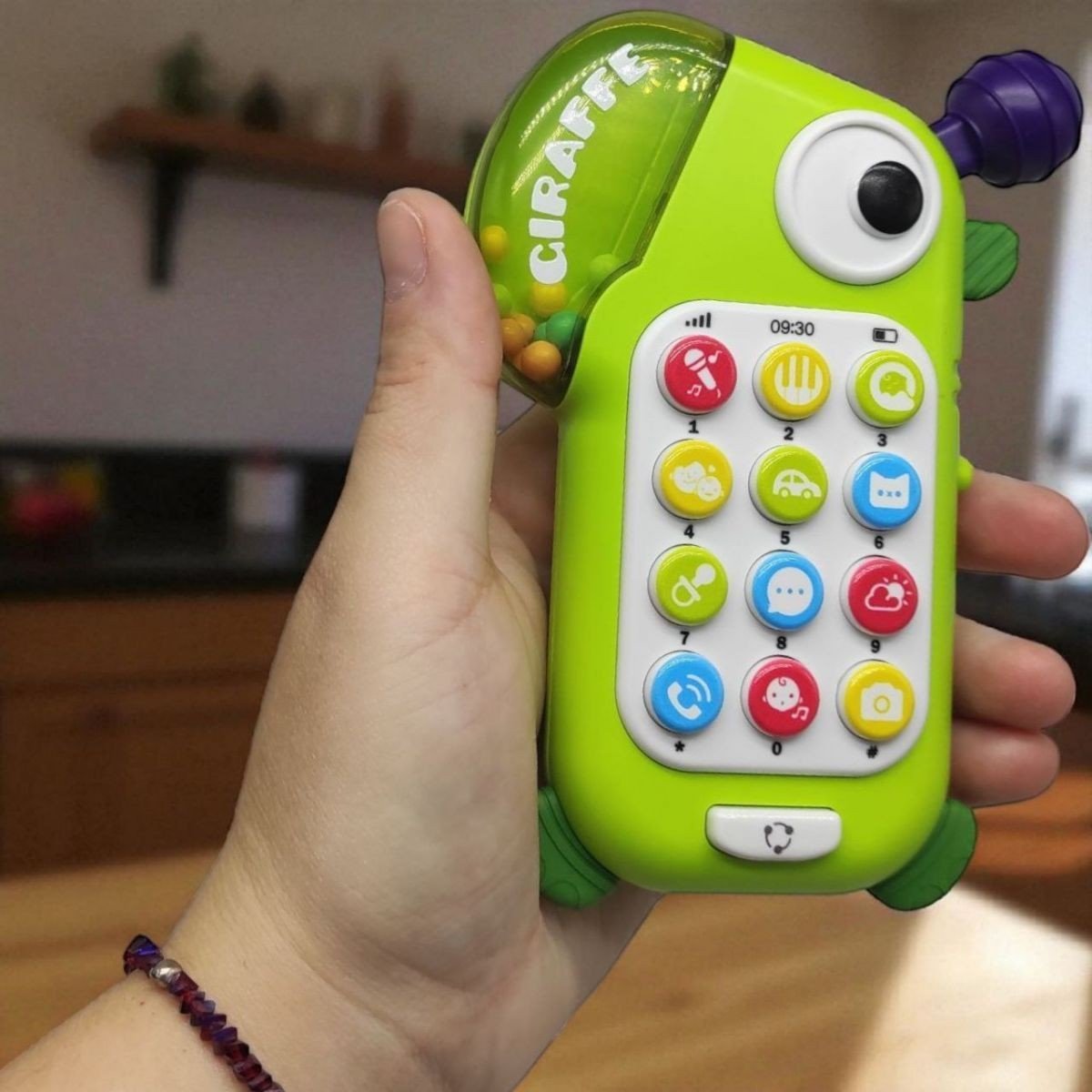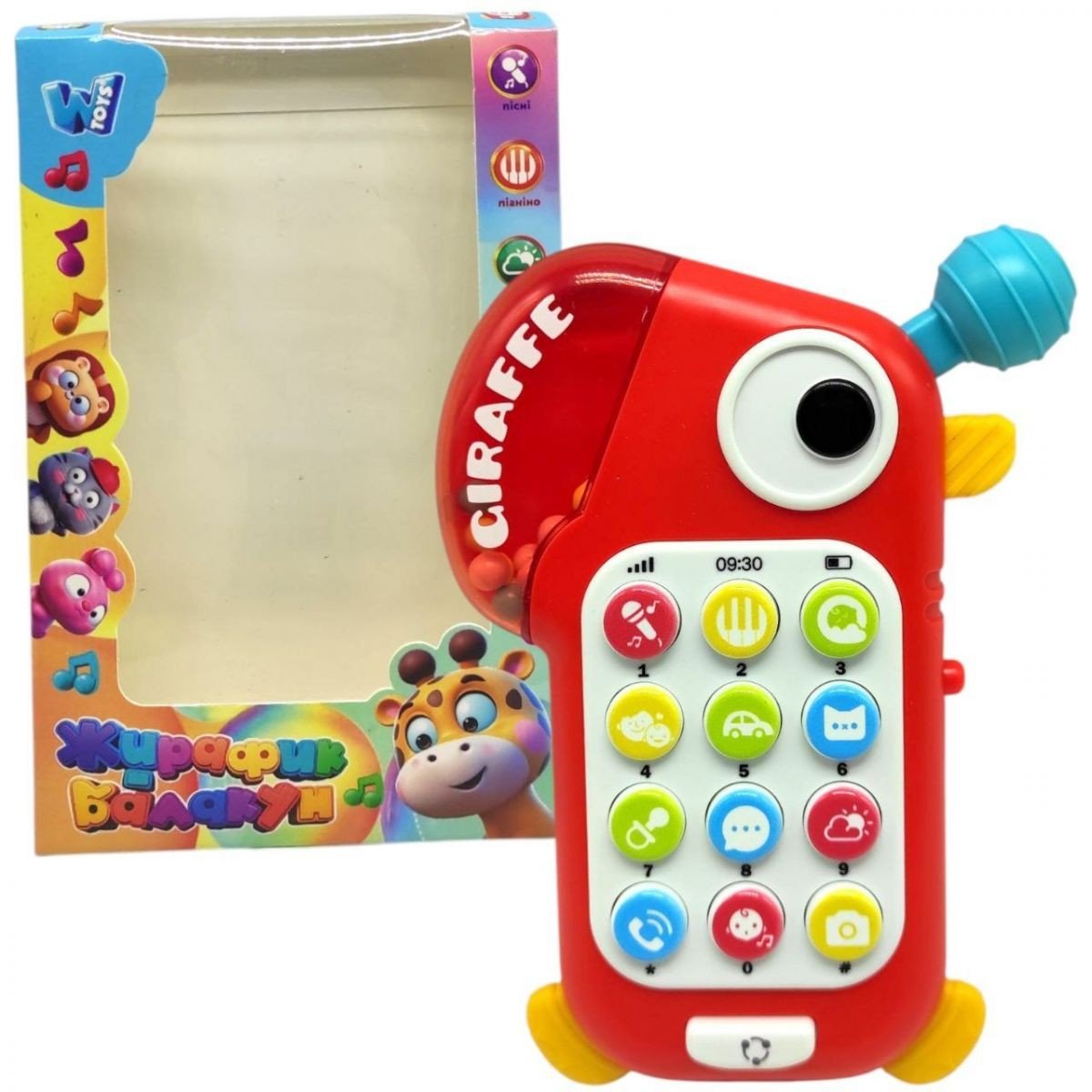 Іграшка телефон у вигляді балакучого жирафа. Подарує безліч позитивних емоцій дитині та має різні режими звуків - казки, пісні та багато різноманітних звуків! Іграшка може виконувати роль не тільки телефону, а ще й брязкальця. Виготовлена з полімерних матеріалів. Рекомендовано для діток від 18 місяців.
