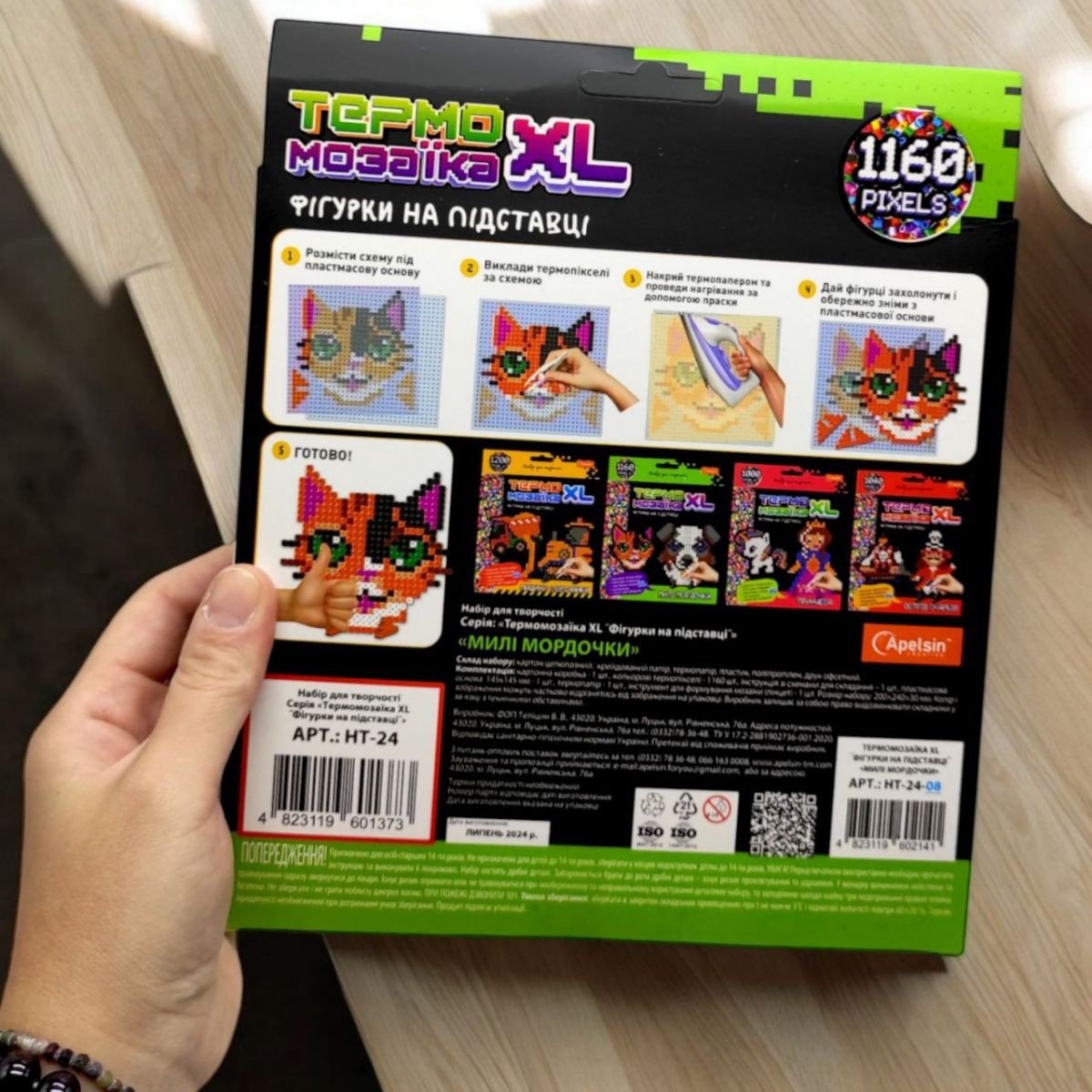 Набір для творчості "Термомозаїка", з яким дитина зможе зібрати фігурку на підставці. Термомозаїка - це мозаїка з пластмасових різнокольорових намистин циліндричної форми. Ці намистини одягаються на основу – спеціальні планшети з короткими штирьками, а потім прогладжуються праскою через термопапір (кальку). При високій температурі верхній шар пластику плавиться, і намистини скріплюються між собою.