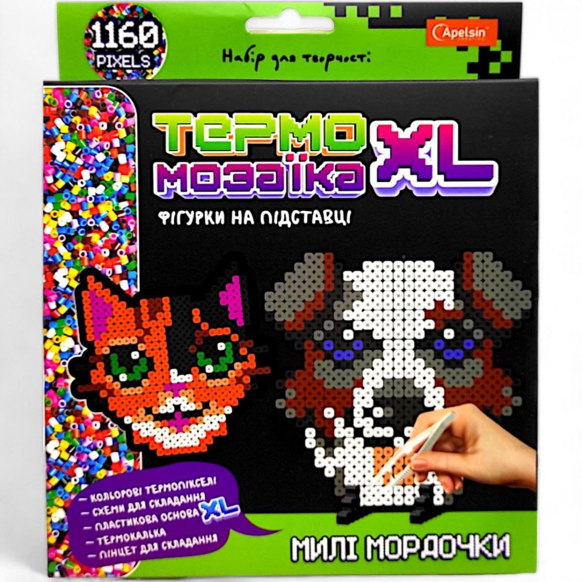 Бренд: Апельсин Упаковка: Коробка Колір: Різнобарв'я Вага з упаковкою: 167 г Габарити в упаковці: 24 x 20 x 3 см Країна виробник: Україна Матеріал: Комбінований Комплектація: Комплект кольорових термопікселів, інструкція зі схемами, пластмасова основа, термопапір, пінцет