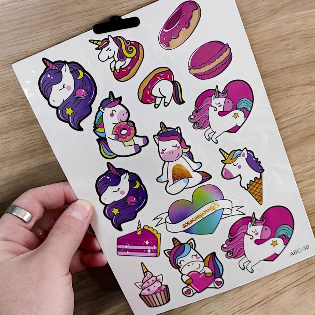 Набір кольорових тимчасових татуювань, стилізованих під різних єдинорогів. Спосіб нанесення досить простий: вирізати необхідну картинку, наклеїти на руку або іншу частину тіла, змочити теплою водою, відклеїти. Виглядають як справжні тату. Водостійкі і тримаються на тілі до 7 днів. Виконано з якісних та безпечних матеріалів.