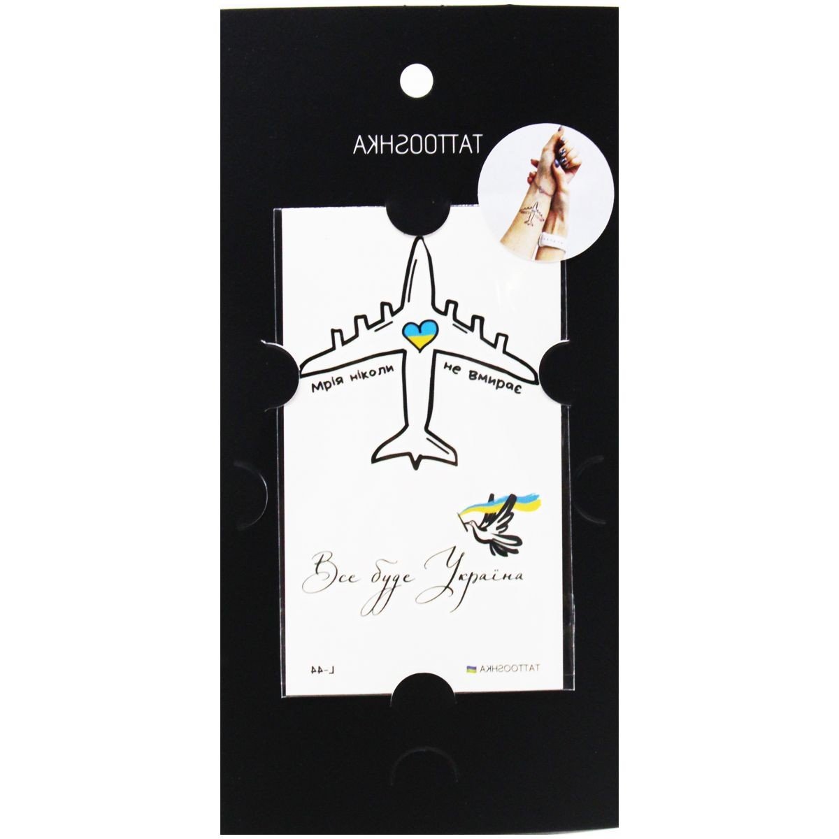 Набір татуювань-перебивок "Tattooshka". В упаковці дві патріотичні татуювання. Вирізати необхідне тату, наклеїти на руку або іншу частину тіла, змочити теплою водою, відклеїти. Розмір листа з татуюванням: 10,5х6 см.