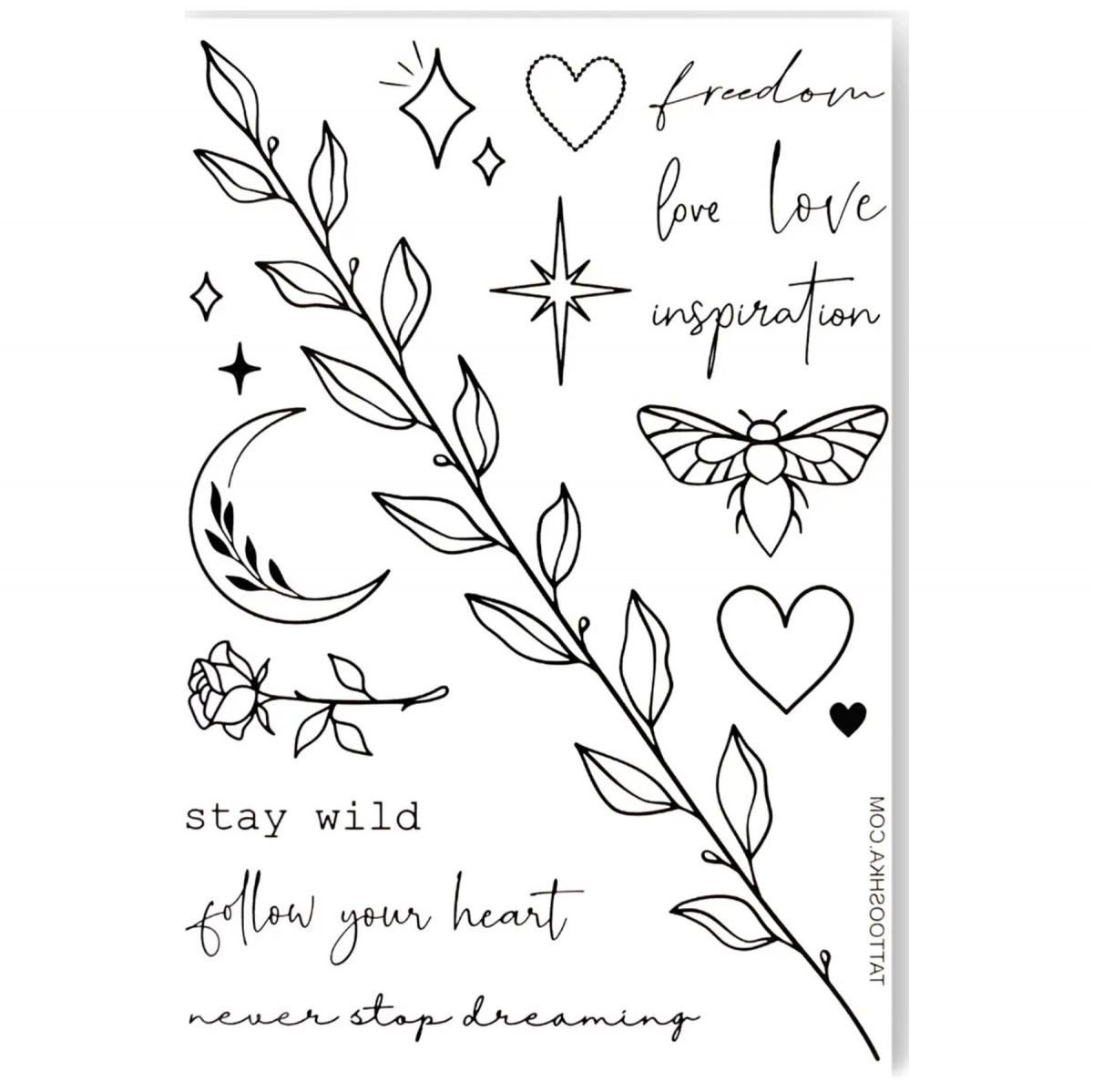 Набір стильних татуювань-перебивок "Tattooshka". В упаковці 1 аркуш із татуюваннями. Спосіб застосування: вирізати необхідне тату, наклеїти на руку або іншу частину тіла, змочити теплою водою, відклеїти. Розмір аркуша з татуюванням: 15х21 см.