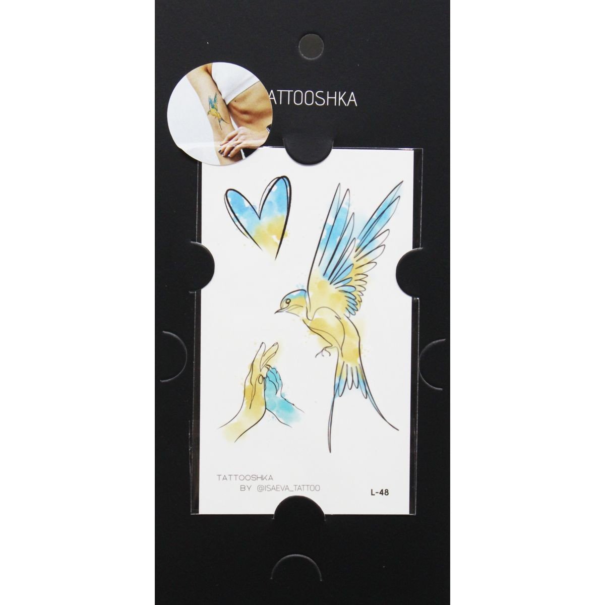 Набір татуювань-перебивок "Tattooshka". В упаковці патріотичні татуювання – у кольорах прапора України. Вирізати необхідне тату, наклеїти на руку або іншу частину тіла, змочити теплою водою, відклеїти. Розмір листа з татуюванням: 10х6,5 см.