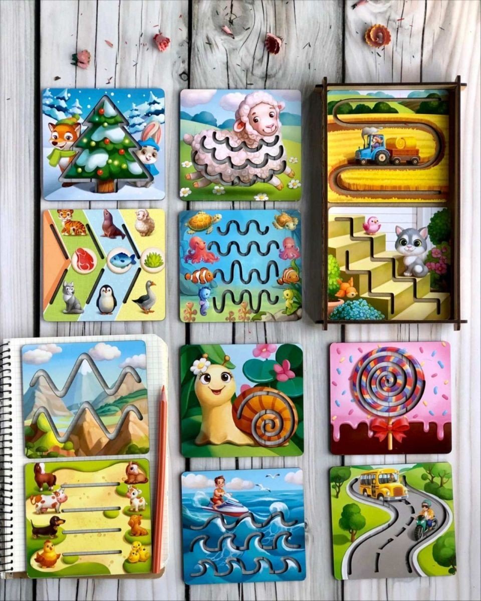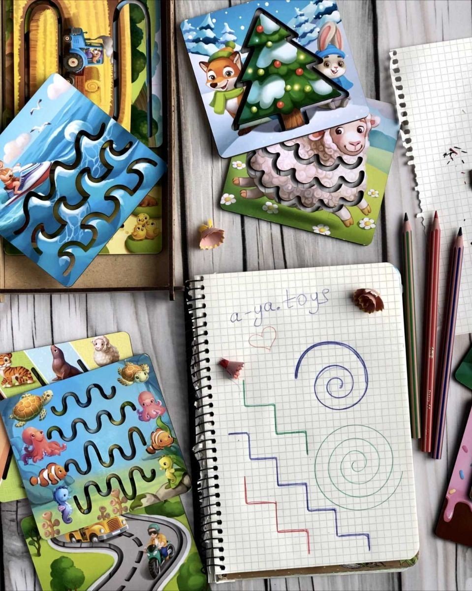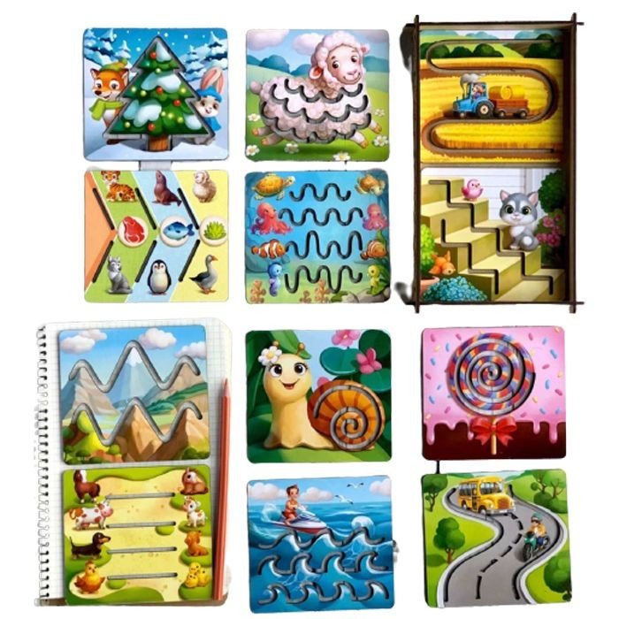 Трафарети маленькі - у наборі 12 трафаретів. Гра для розвитку дрібної моторики. Малювання різних ліній (прямих, хвилястих, зигзаги) для маленької дитини завдання, яке допоможе підготувати руку до письма. На плашках намальовані різні сюжети, щоб дитині було цікавіше вчитися.