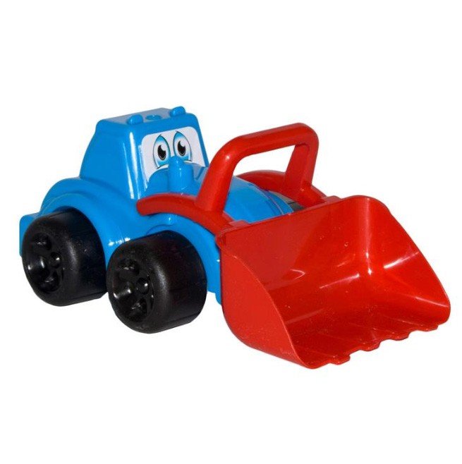 Яскравий пластиковий трактор із зображенням смішного обличчя. Рухомий ківш. Розмір іграшки 27х14х12 см. Іграшка виконана із пластику.