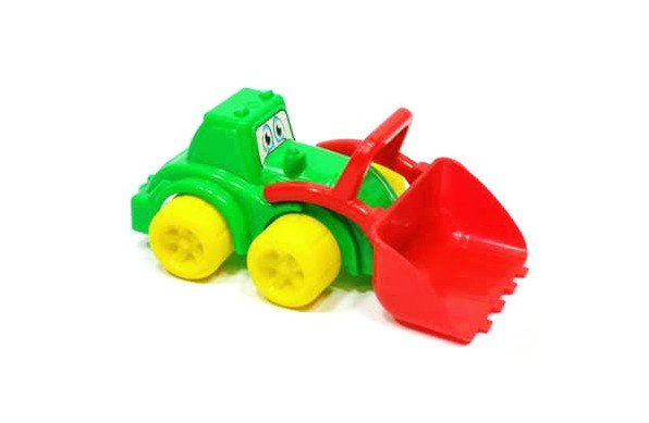 Яскравий пластиковий трактор із зображенням забавного личка. Рухомий ківш.