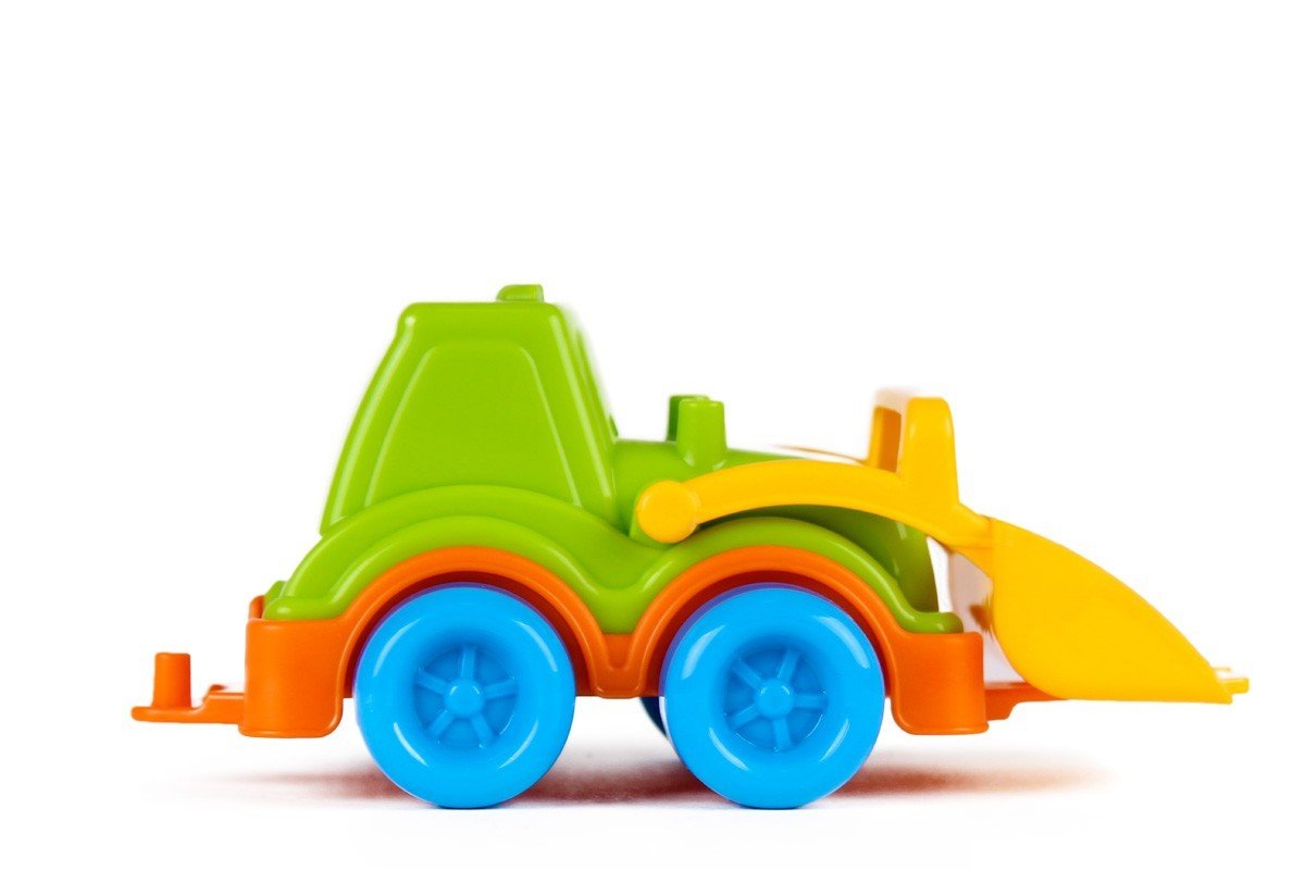 Яскравий, пластиковий, маленький трактор з рухомим ковшем.