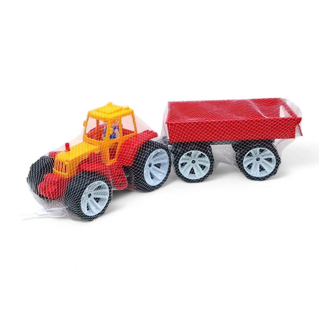 Пластиковий трактор з причепом буде цікавим подарунком дитині. Причіп можна відʼєднати і гратися окремо. Розмір трактора - 25х18х19 см., причепа - 28х14х17,5 см., діаметр коліс - 8,5 см. Виконаний з якісного і міцного матеріалу.