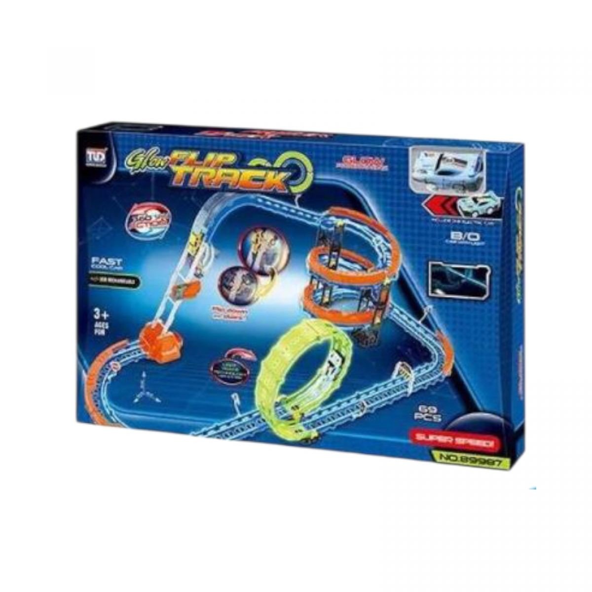 Трек 69 елементів, машинка із вбудованим акумулятором, підсвічування, світиться у темряві, трюки, му