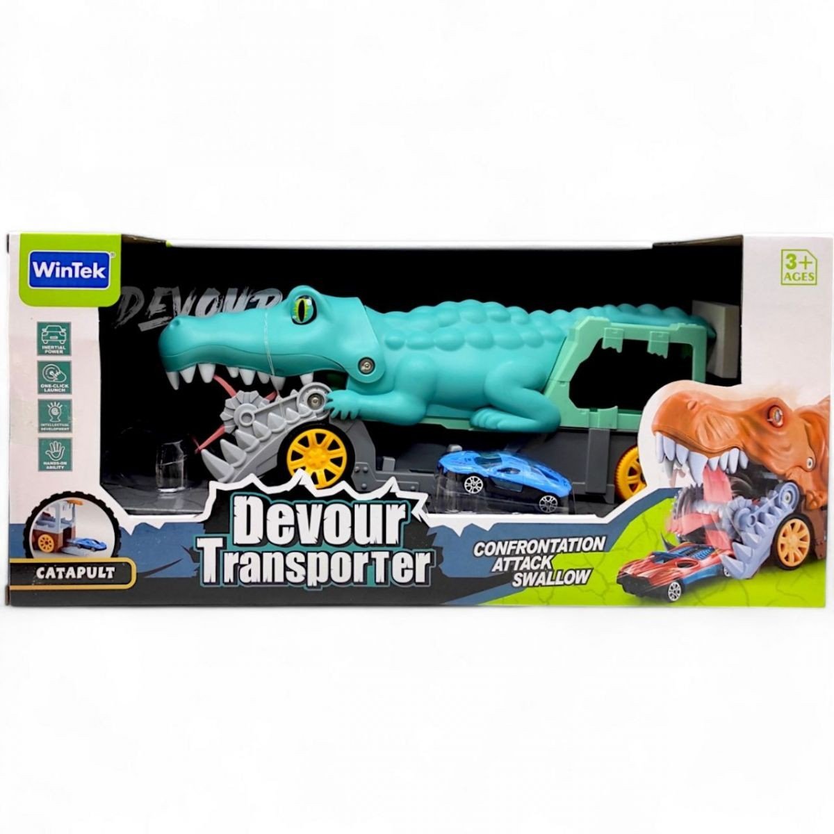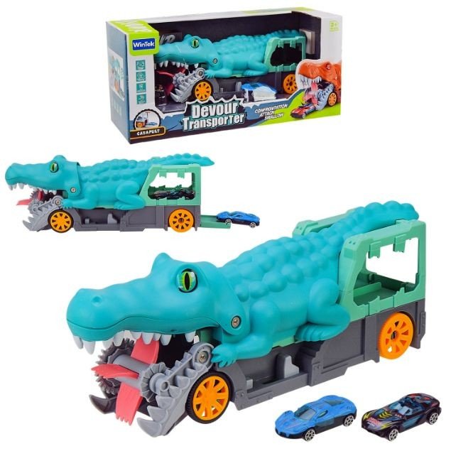 Машина-крокодил трейлер — яскравий ігровий набір у вигляді крокодила, що точно сподобається кожному хлопчику. Оснащений інерційним механізмом, він легко рухається вперед, додаючи азарту до гри. Зручна форма дозволяє запускати машинки та влаштовувати захопливі перегони. Виготовлений із міцного пластику, цей трейлер стане чудовим подарунком до свята чи дня народження. 2 металеві модельки в комплекті.