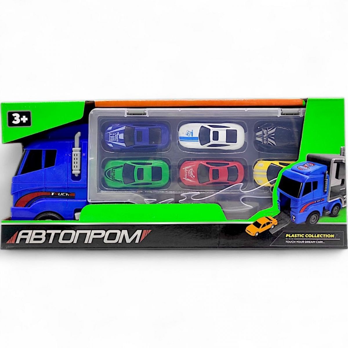 Пластиковий автовоз 34 см з прозорим кузовом та 6 металевими машинками розміром 7 см. Машинки можна розмістити в кабіні автовоза, потягнути за важіль, та спостерігати, як вони скочуються гіркою. Відмінний набір для шанувальників машинок та ігор з транспортом!