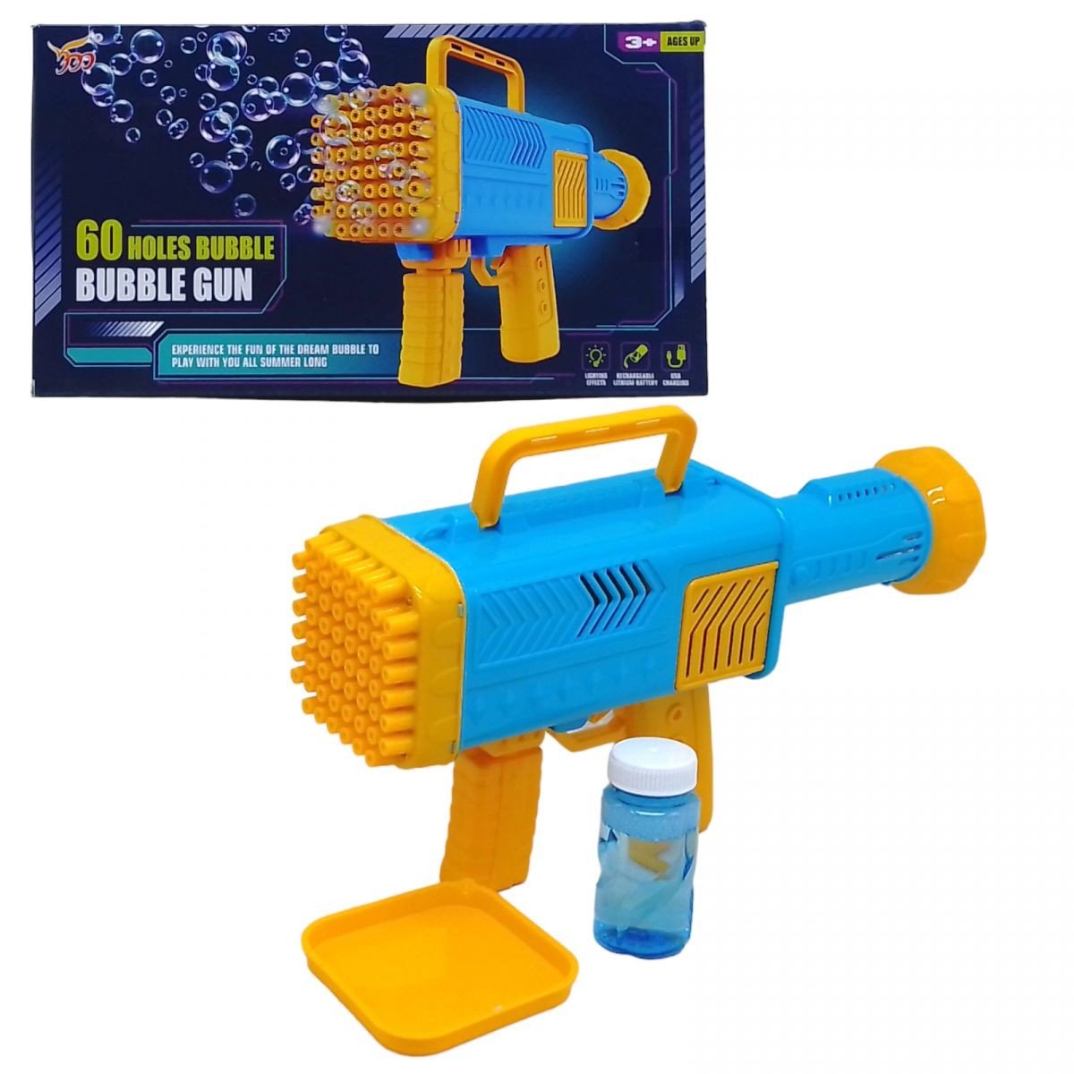 Акумуляторний пістолет із мильними бульбашками "Bubble Gun". Має цілих 60 отворів для випускання бульбашок, що дозволяє створювати велику кількість бульбашок одним пострілом. Пістолет ідеально підходить для гри як на вулиці, так і вдома. Має яскраве підсвічування. Мильний розчин, акумулятор та USB для зарядки є в комплекті. Розмір бластера у зібраному вигляді: 30 х 16 х 8 см.