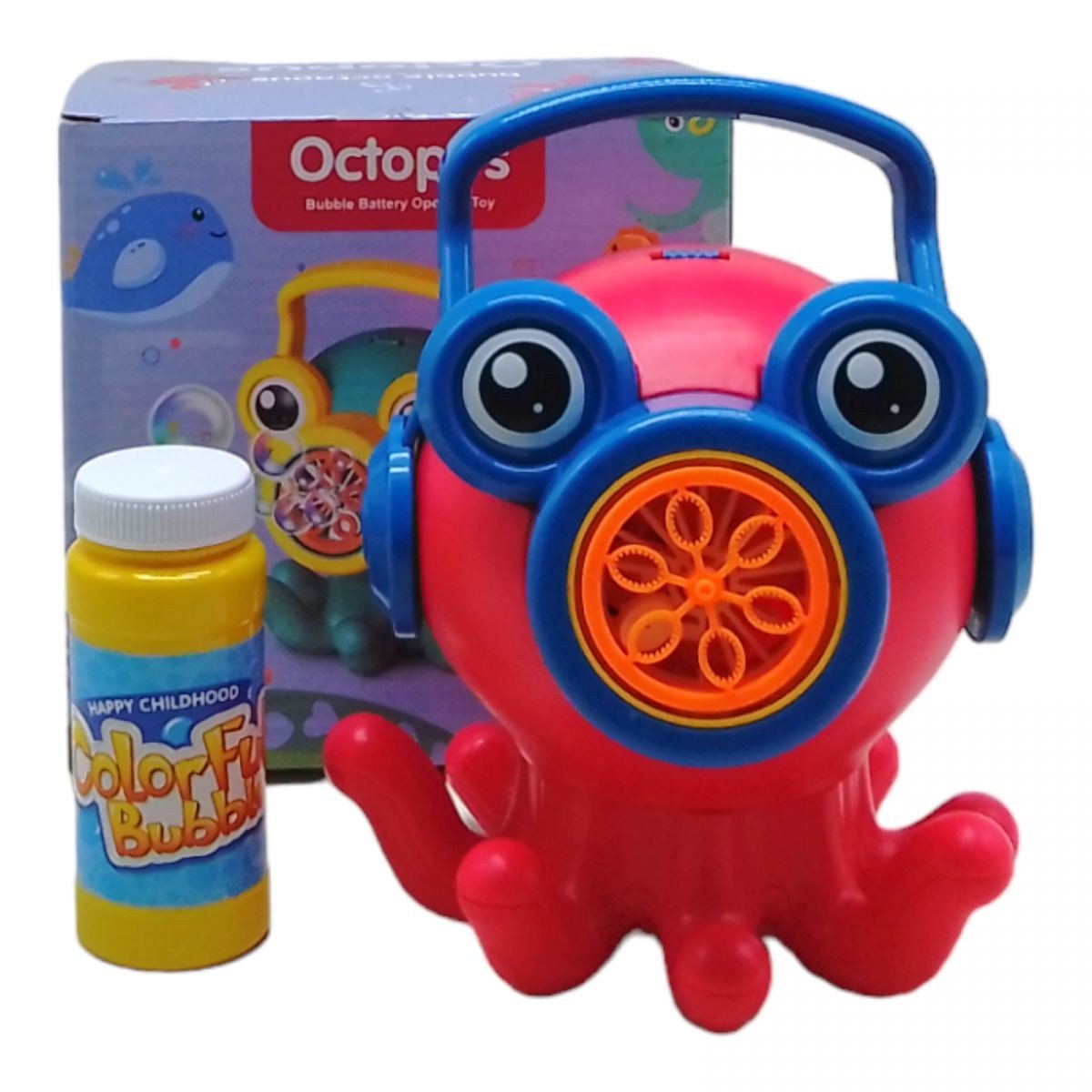Набір для пускання мильних бульбашок із запускалкою у вигляді смішного восьминіжка. У комплекті є пляшечка із мильним розчином, який потрібно залити в іграшку. Після включення іграшка почне обертатися навколо своєї осі та пускати велику кількість мильних бульбашок. Є зручна ручка для транспортування. Іграшка працює від 4-х батарейок АА (немає в комплекті).