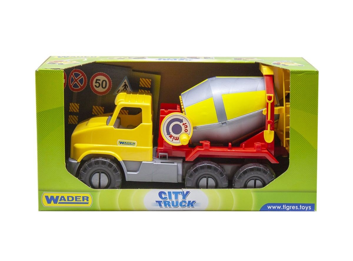 Великий дитячий іграшковий вантажівка-бетономішалка. Має обертовий барабан бетономішалки, завдяки якому гра з іграшкою ставати більш захоплюючою і реалістичною. Машинка виготовлена з міцного пластику через що дитина з працею зможе її зруйнувати, а отже, максимально довго з нею грати.