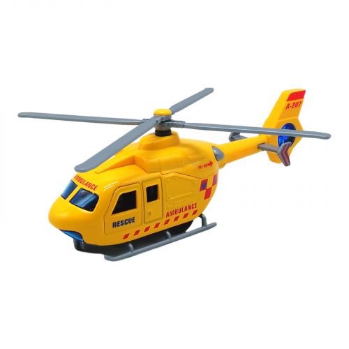 Інерційна іграшка у вигляді реалістичного гвинтокрила. Виготовлена з металу та пластику. Відчиняються передні двері. На гелікоптері є дві кнопки: одна включає світлові та звукові ефекти, інша змушує обертатися лопаті. Розмір іграшки – 20 х 7 х 4,5 см.