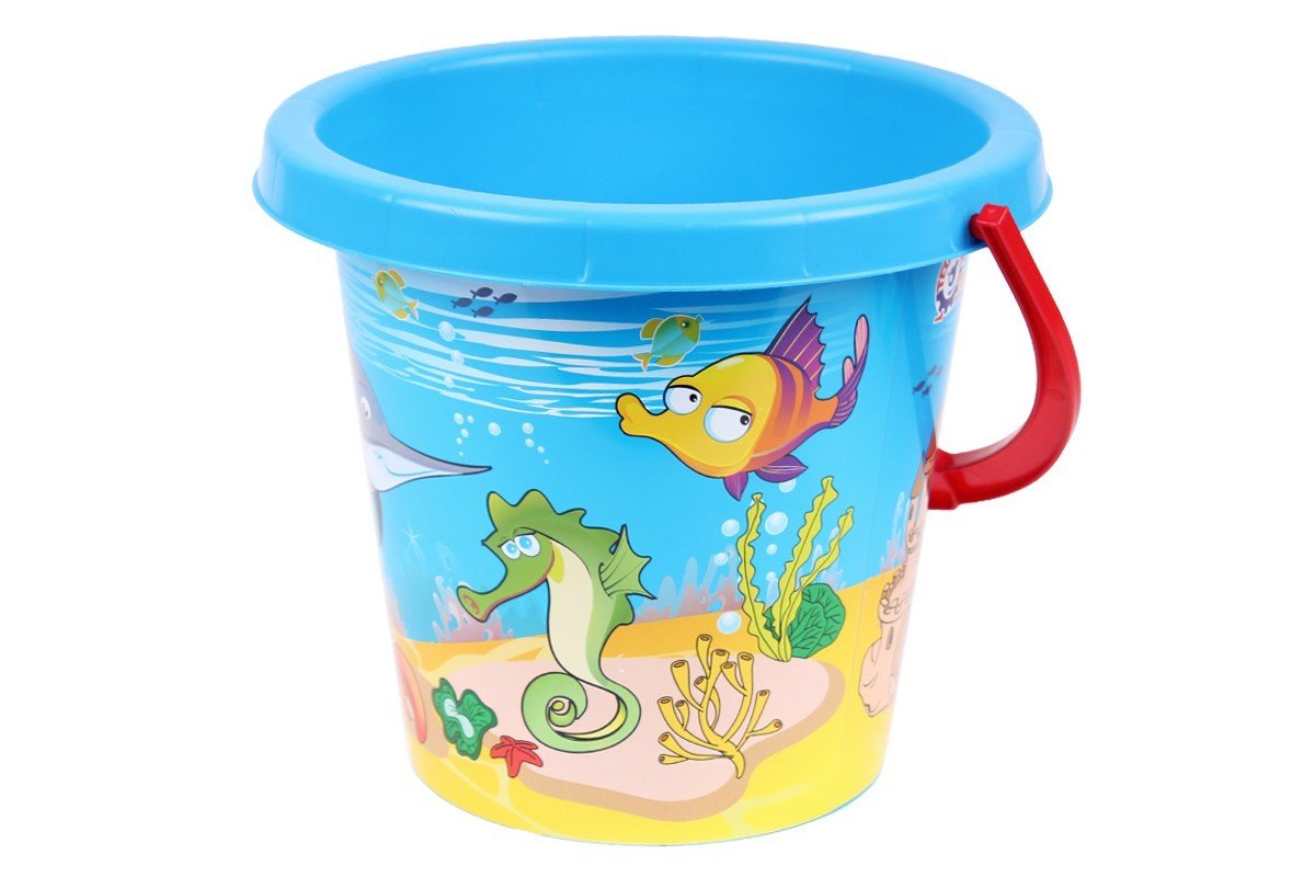 Яскраве пластикове відерце з барвистим малюнком і зручною ручкою.