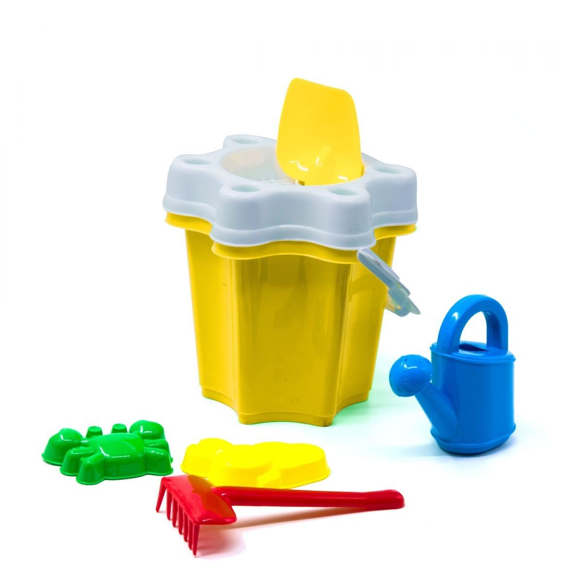 Велике відерце (22 х 22 х 20 см) у формі квітки з набором для гри в піску: лопатка, граблі, лійка, 2 пасочки, сито. Підходить для гри вдома, на вулиці, в саду і на пляжі.