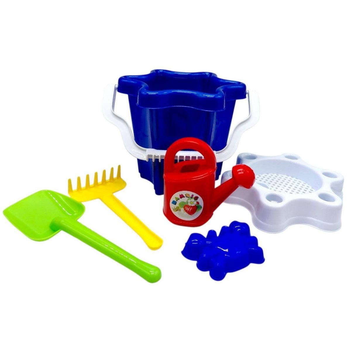 Набір для піску. 5 видів. Відерце (форма - квітка), лійка, сито, пасочка, лопатка, грабельки. Пластик.