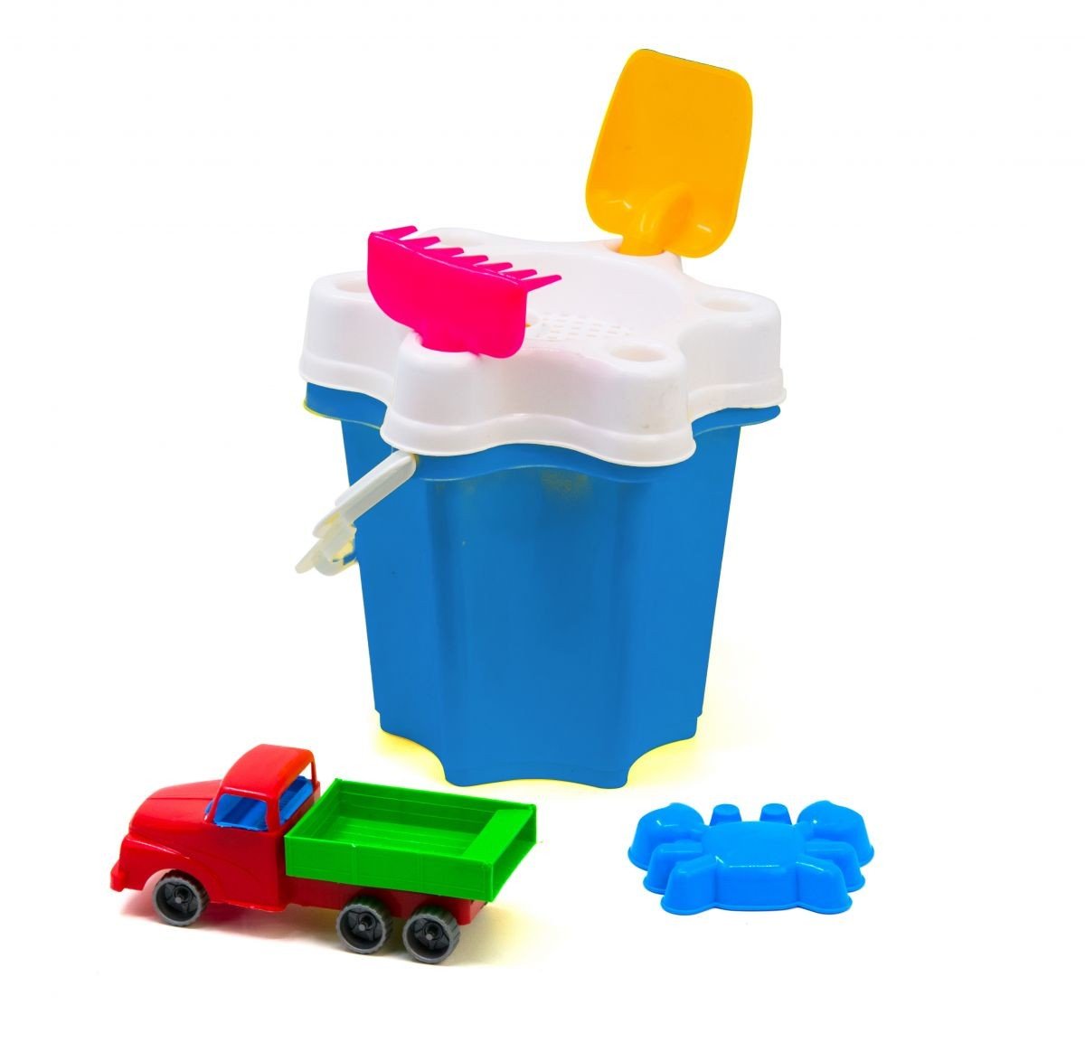 Велике відерце (22 х 22 х 20 см) у формі квітки з набором для гри в піску: лопатка, граблі, вантажівка, пасочка, сито. Підходить для гри вдома, на вулиці, в саду і на пляжі.