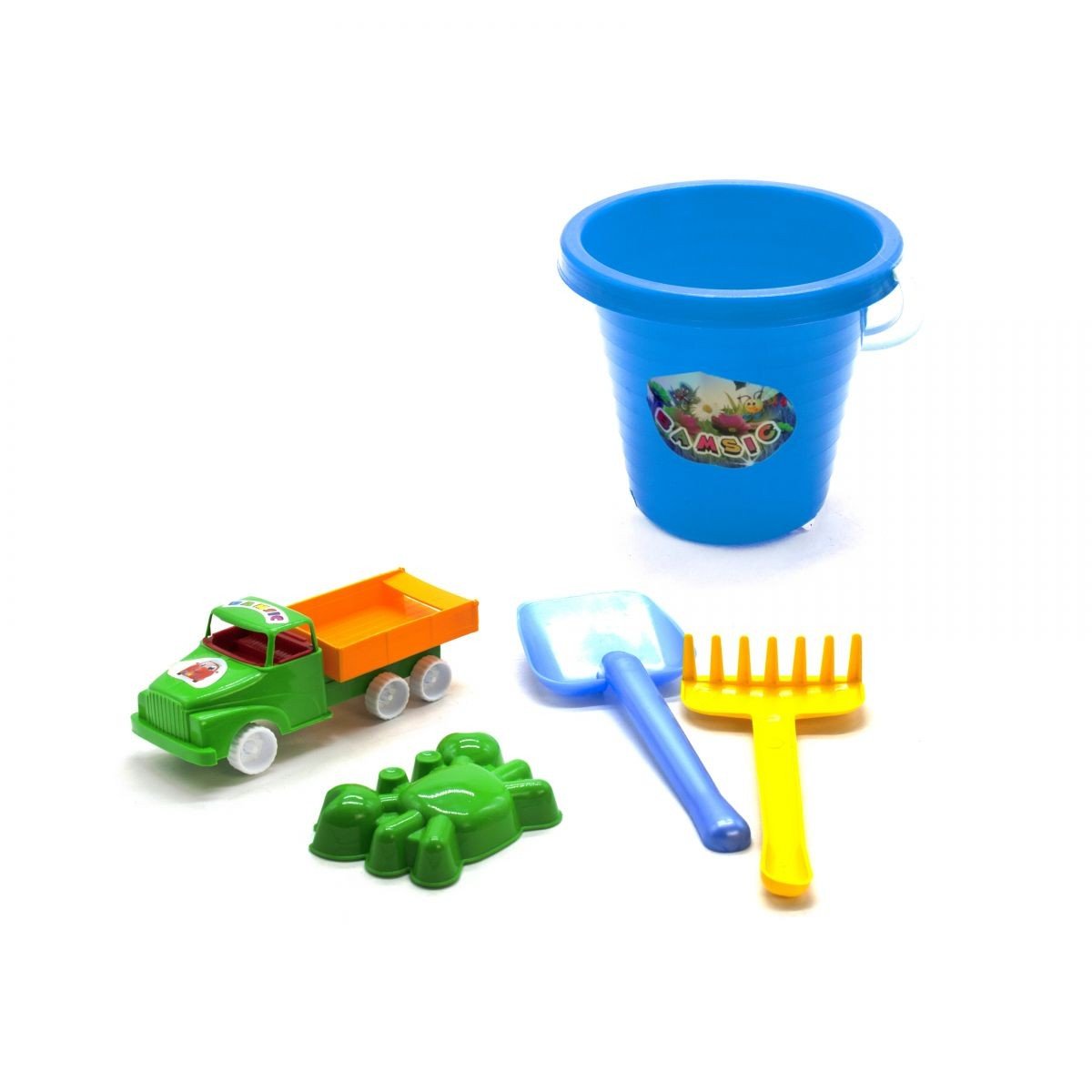 Відро маленьке з пісочним набором і машинкою підходить для гри вдома, на вулиці, в саду і на пляжі. У наборі є: відро (16 х 14 х 12 см), машинка самоскид (18 х 6,5 х 6,5 см), лопатка (25 см), граблі (19,5 см), пасочка.