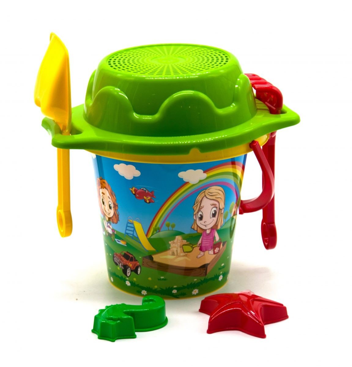 У набір для гри в піску входять: відро (23 х 21 х 18 см), сито (27 х 22 х 7,5 см), лопатка (22 см), грабельки (19 см) і 2 формочки.
