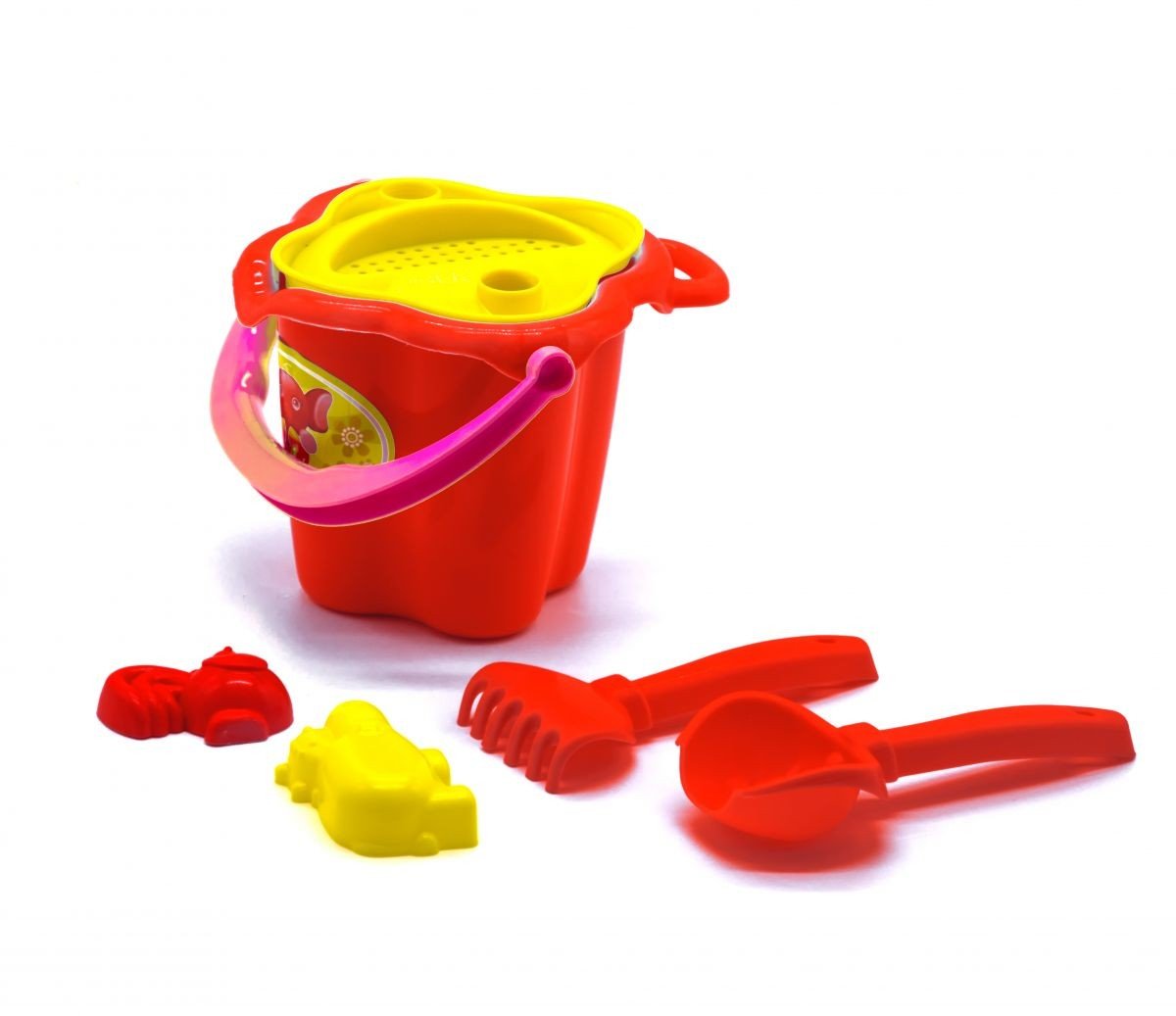 Відро з пісочним набором "Сонечко". Підходить для гри вдома, на вулиці, в саду і на пляжі. Включає в себе: відро (18 х 19 х 21 см), сито, граблі (7 х 2 х 15 см), лопатка (7 х 3 х 17,5 см), 2 пасочки.