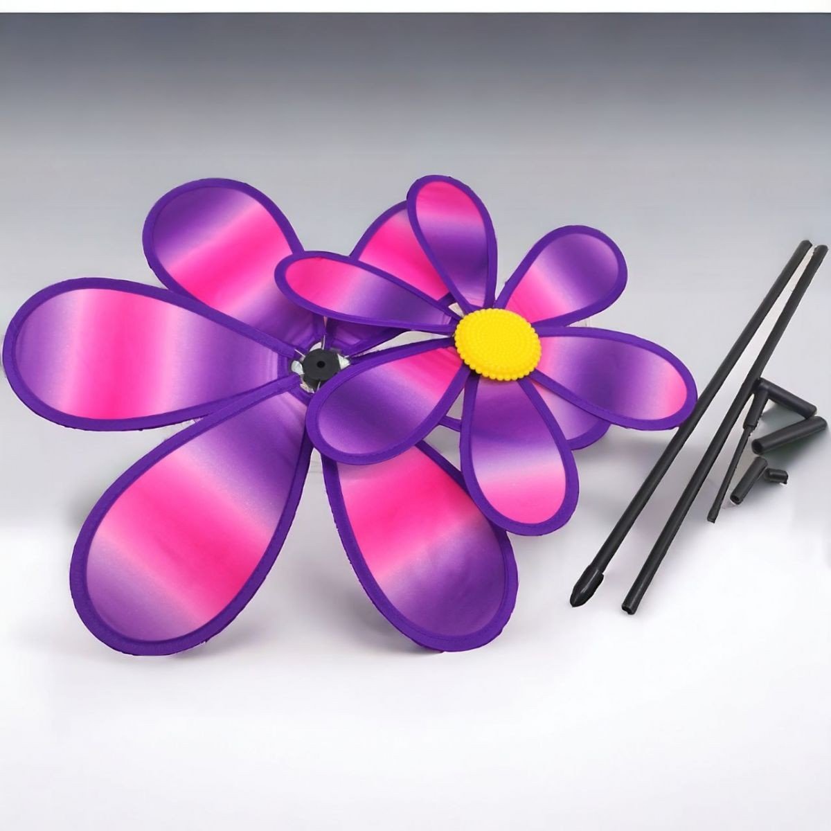 Яскрава іграшка-вітрячок. Іграшка складається з 2-х основ у вигляді текстильної квіточки-вертушки (28 см., та 38 см.) та палички, на яку все це кріпиться. При подиху вітру - вертушка швидко крутитиметься навколо серединки. Висота з кріпленням - 89 см. Виконано з якісних та міцних матеріалів.