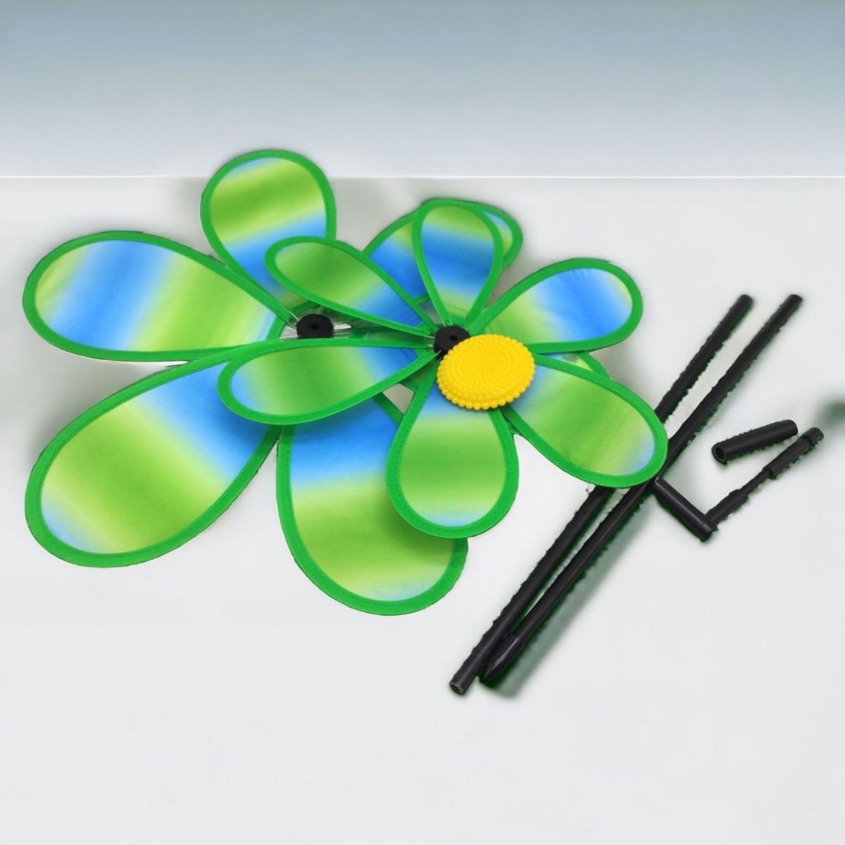 Яскрава іграшка-вітрячок. Іграшка складається з 2-х основ у вигляді текстильної квіточки-вертушки (28 см., та 38 см.) та палички, на яку все це кріпиться. При подиху вітру - вертушка швидко крутитиметься навколо серединки. Висота з кріпленням - 89 см. Виконано з якісних та міцних матеріалів.