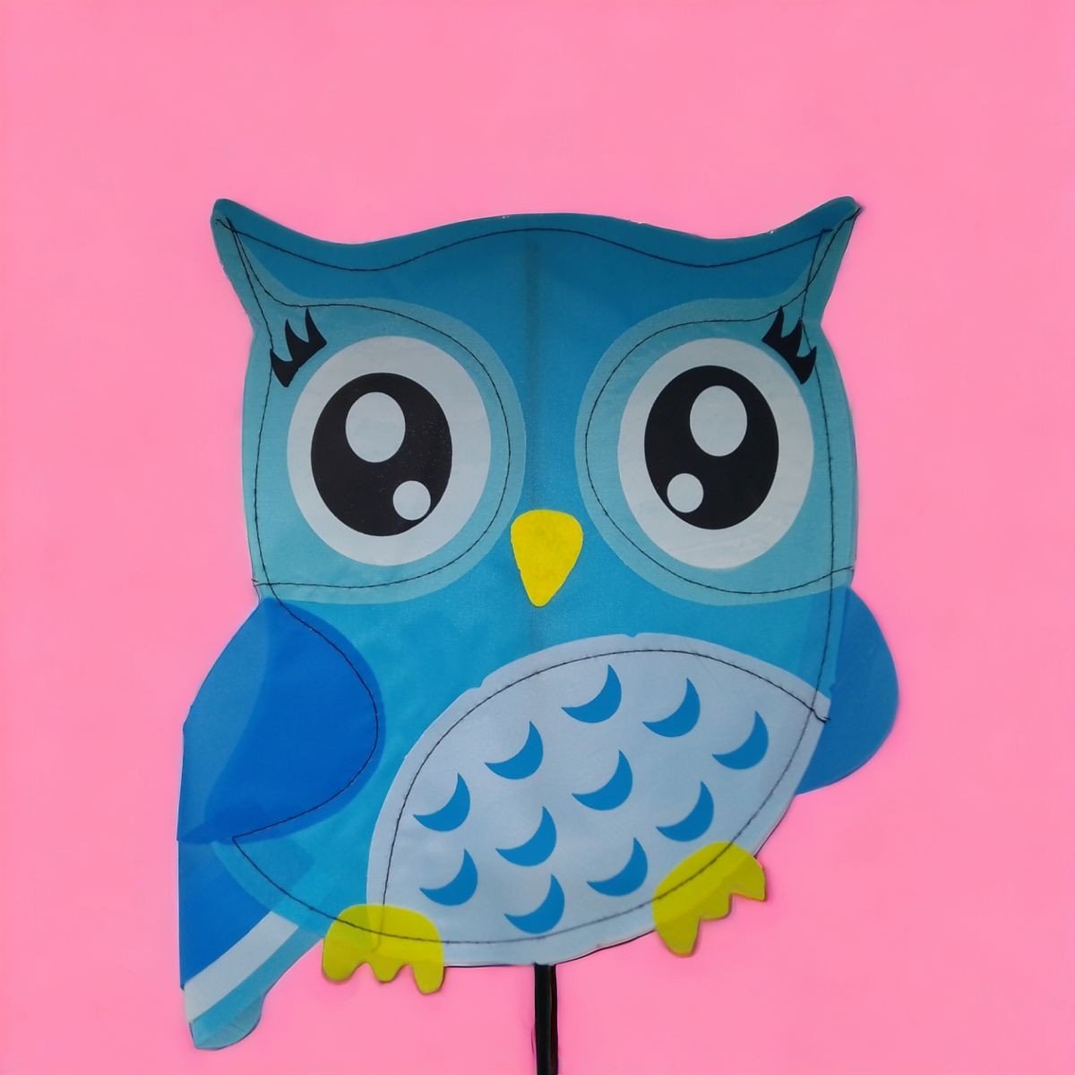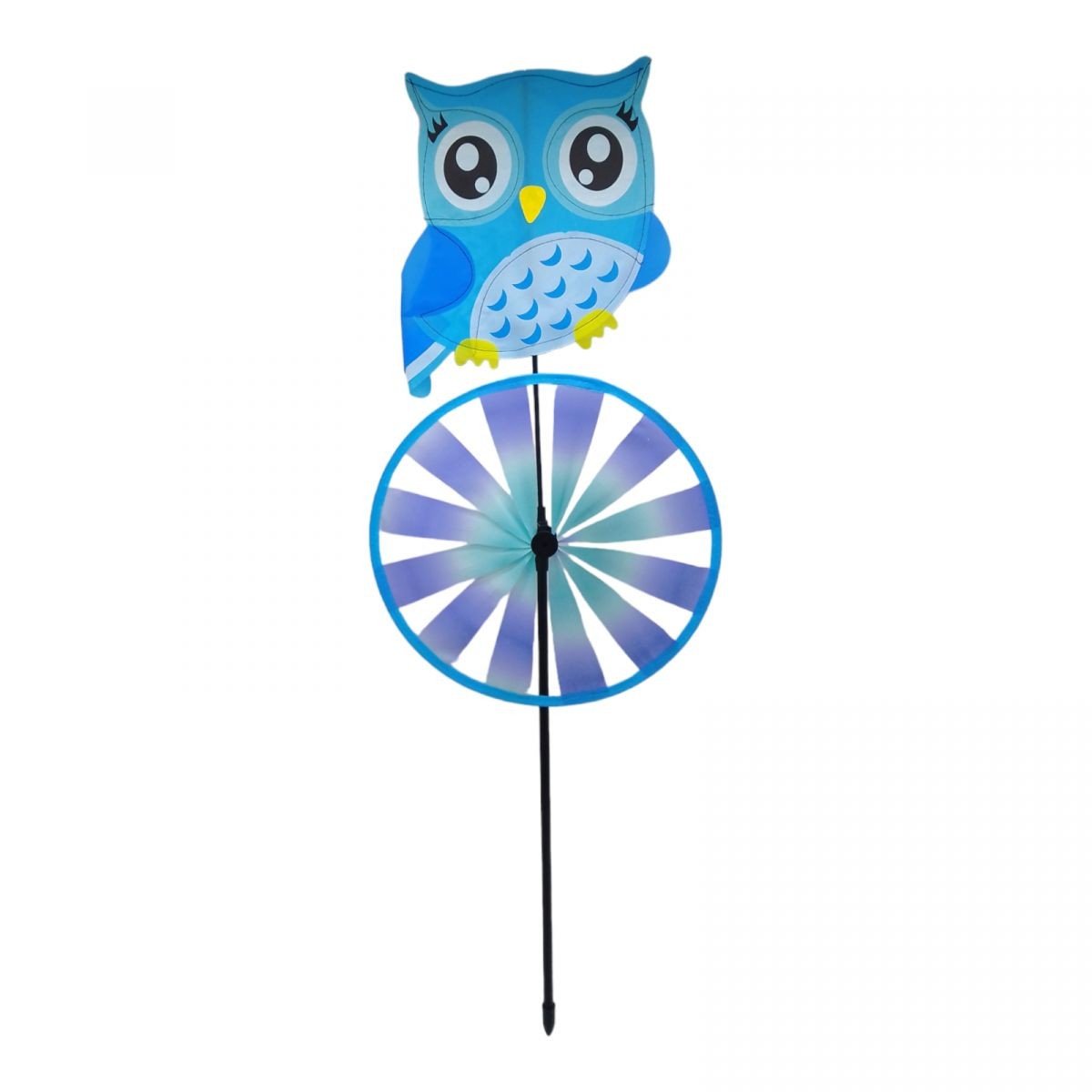 Яскрава іграшка-вітрячок. Іграшка складається з 2-х основ у вигляді текстильної сови та вертушки, а також палички, на яку все це кріпиться. При подиху вітру - вертушка швидко крутитиметься навколо серединки. Висота з кріпленням - 75 см, діаметр вертушки - 25,5 см, розмір основи-сови, приблизно 22х20 см. Виконано з якісних та міцних матеріалів.