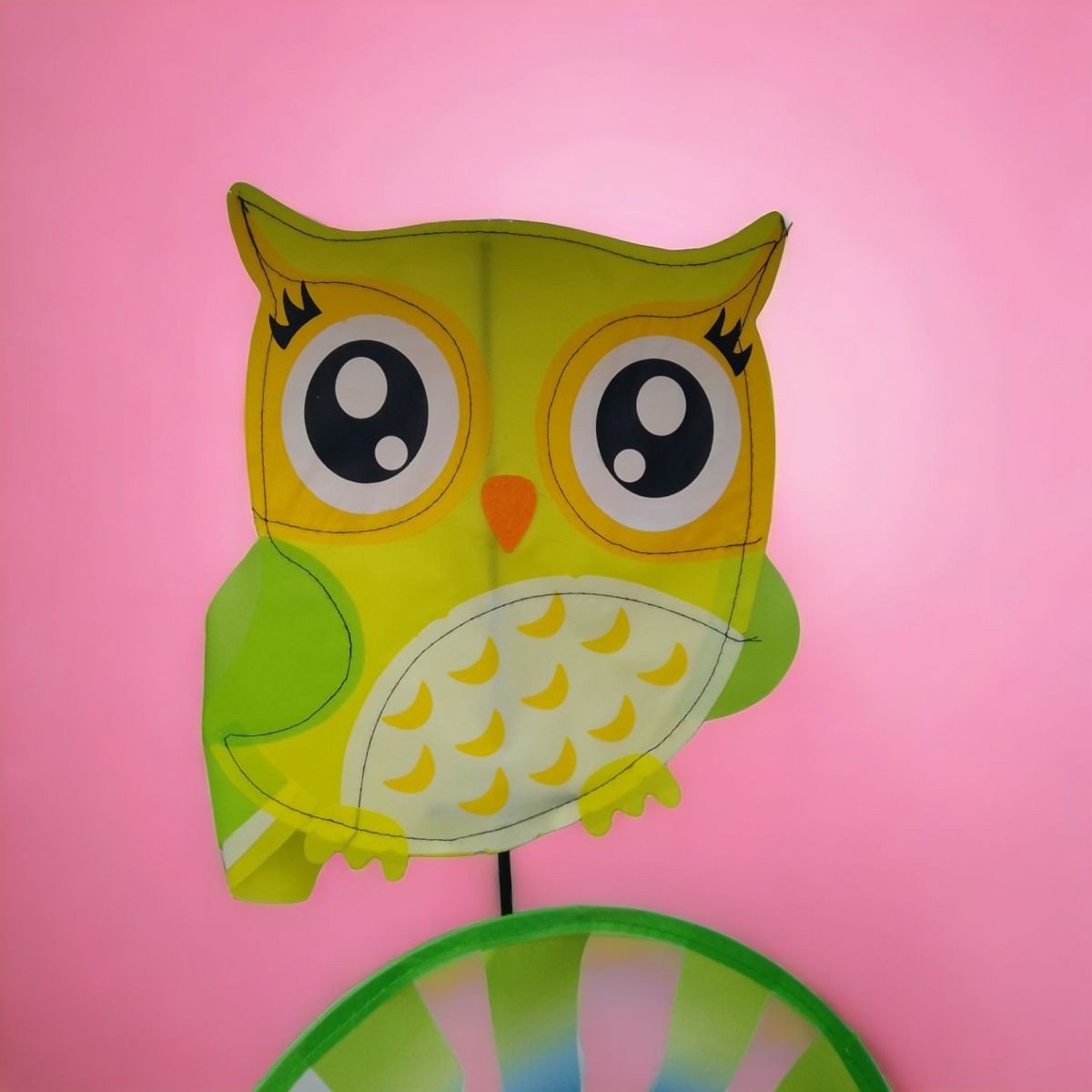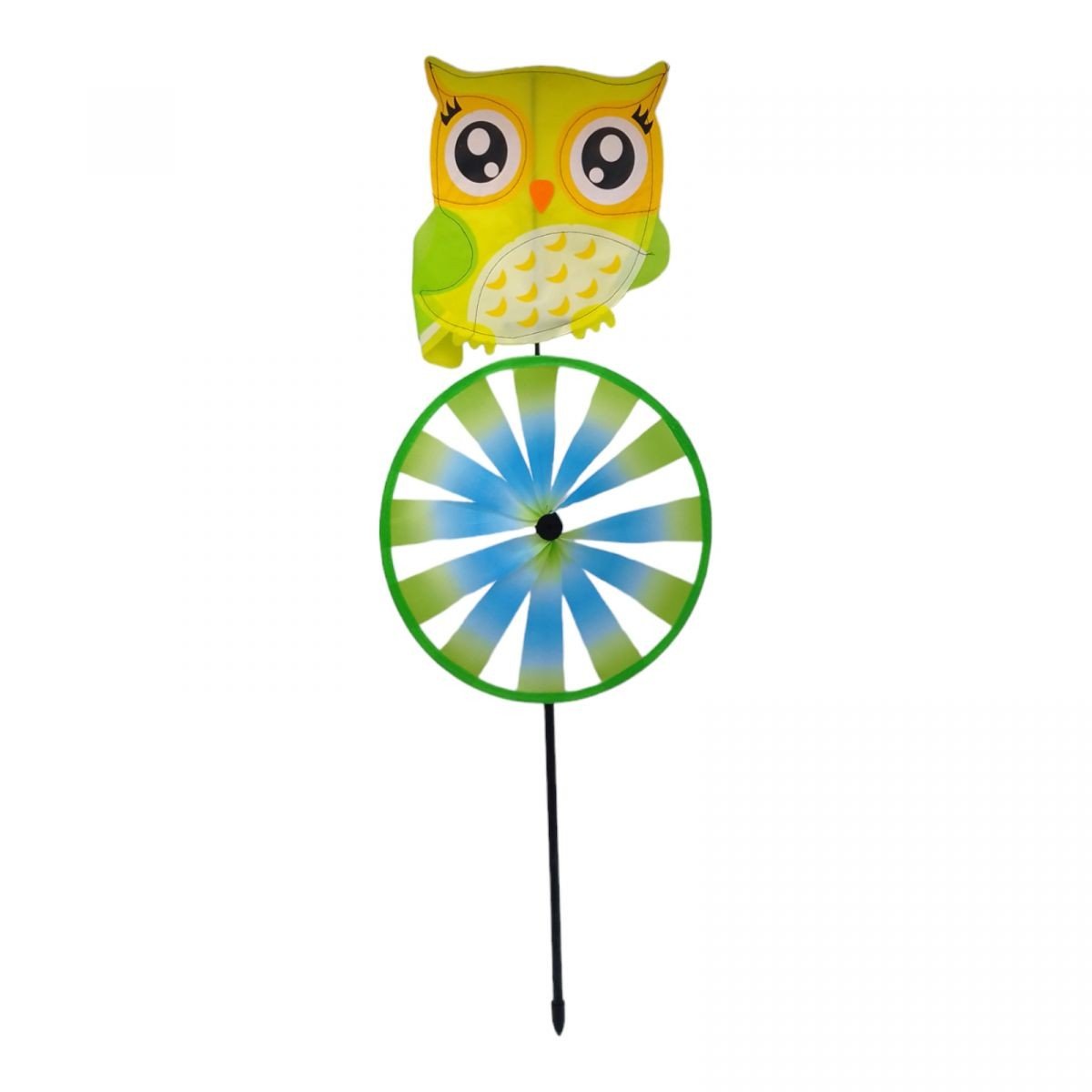 Яскрава іграшка-вітрячок. Іграшка складається з 2-х основ у вигляді текстильної сови та вертушки, а також палички, на яку все це кріпиться. При подиху вітру - вертушка швидко крутитиметься навколо серединки. Висота з кріпленням - 75 см, діаметр вертушки - 25,5 см, розмір основи-сови, приблизно 22х20 см. Виконано з якісних та міцних матеріалів.