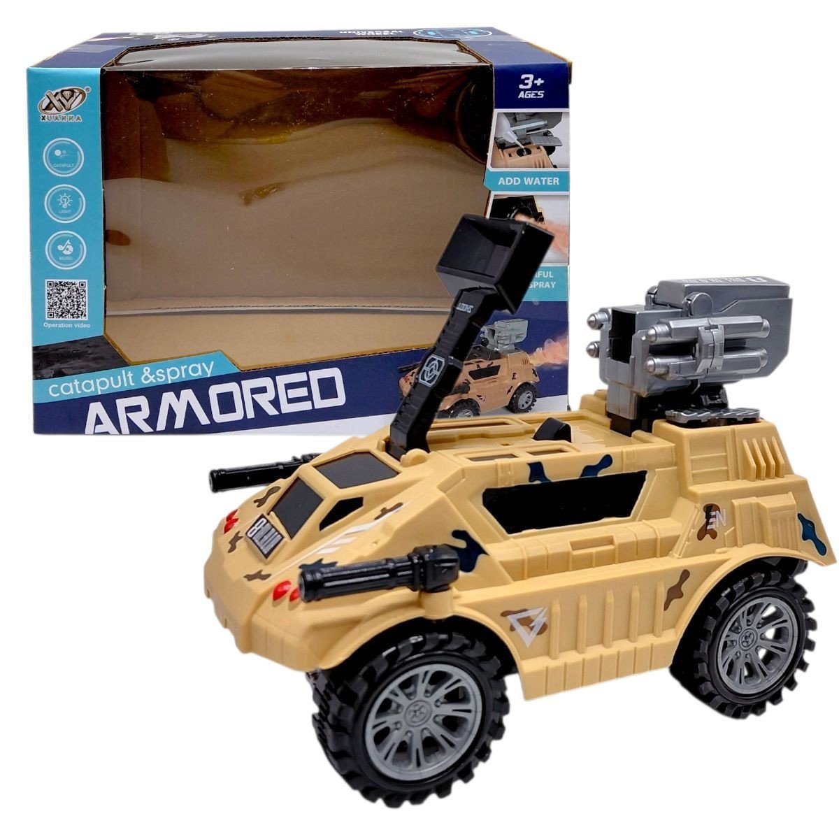 Військовий бронетранспортер зі зброєю на корпусі з катапультою, що випускає маленькі гранати! Іграшка оснащена функцією катапульти, що працює, за допомогою спеціального механізму, який запускає кульки. Має світлові елементи що поєднуються зі звуковими ефектами. При запусканні транспорт починає їздити у різні боки, крутитися, випускати пару (якщо залити воду) та стріляти кульками! Виконана з якісних та міцних матеріалів. Рекомендовано для дітей старше 3 років.