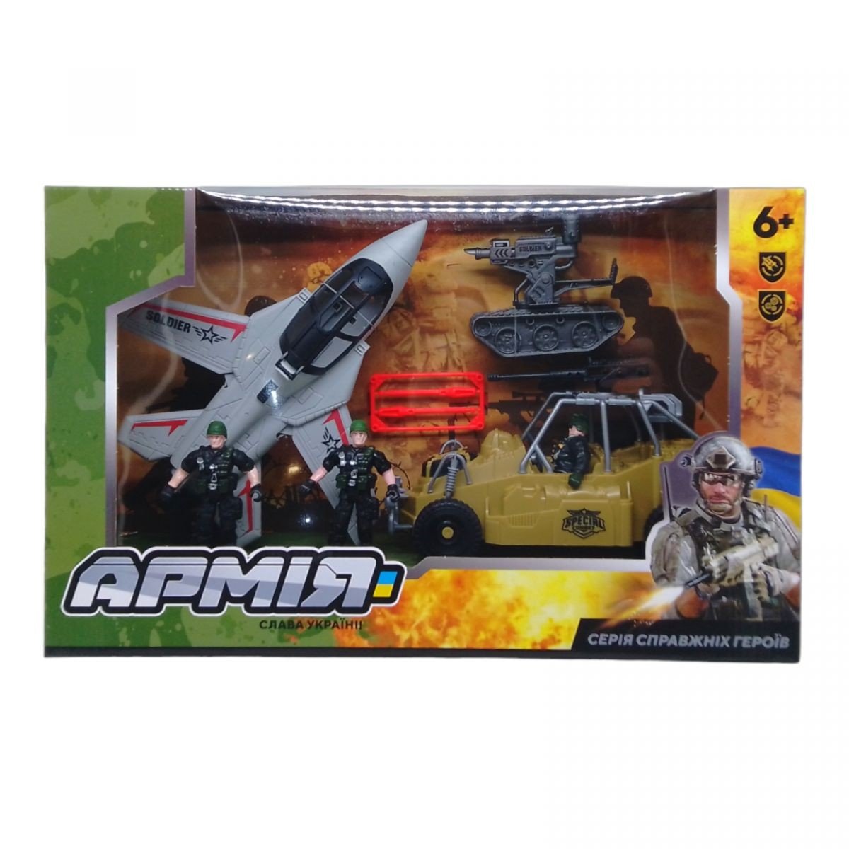 Военний набір - це цікава іграшка, яка пропонує дитині цікавий світ стратегій та рольових ігор. В комплекті представлені різноманітні елементи, які дозволяють створювати реалістичні сценарії бойових дій. У наборі є: літак, військовий позашляховик, пушка (стріляє снарядами), 3 солдатика, снаряди. Розмір фігурок - 10 см.