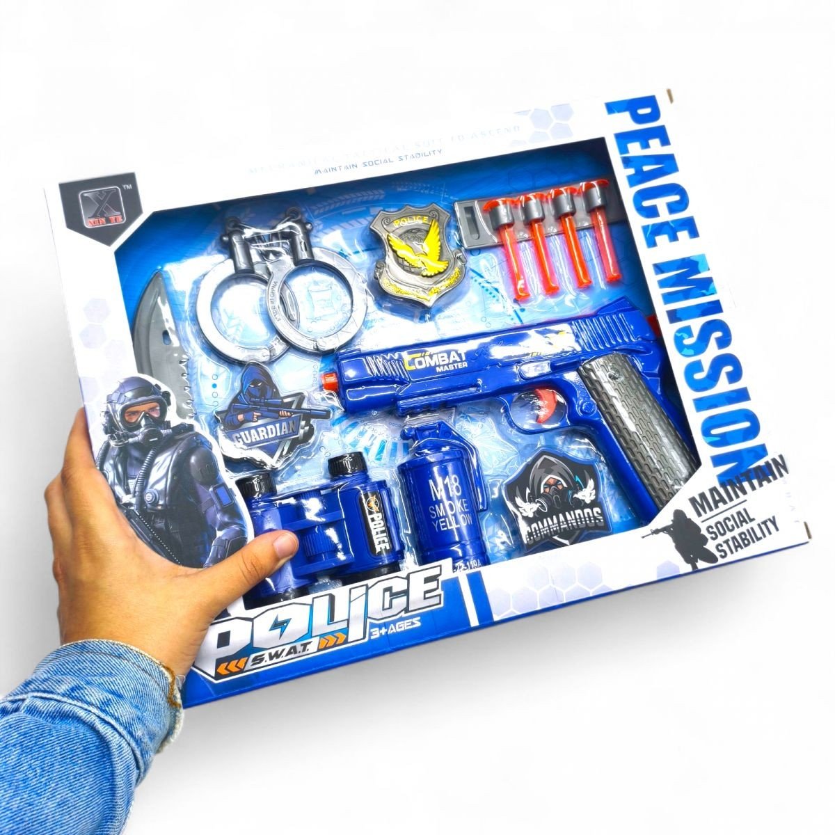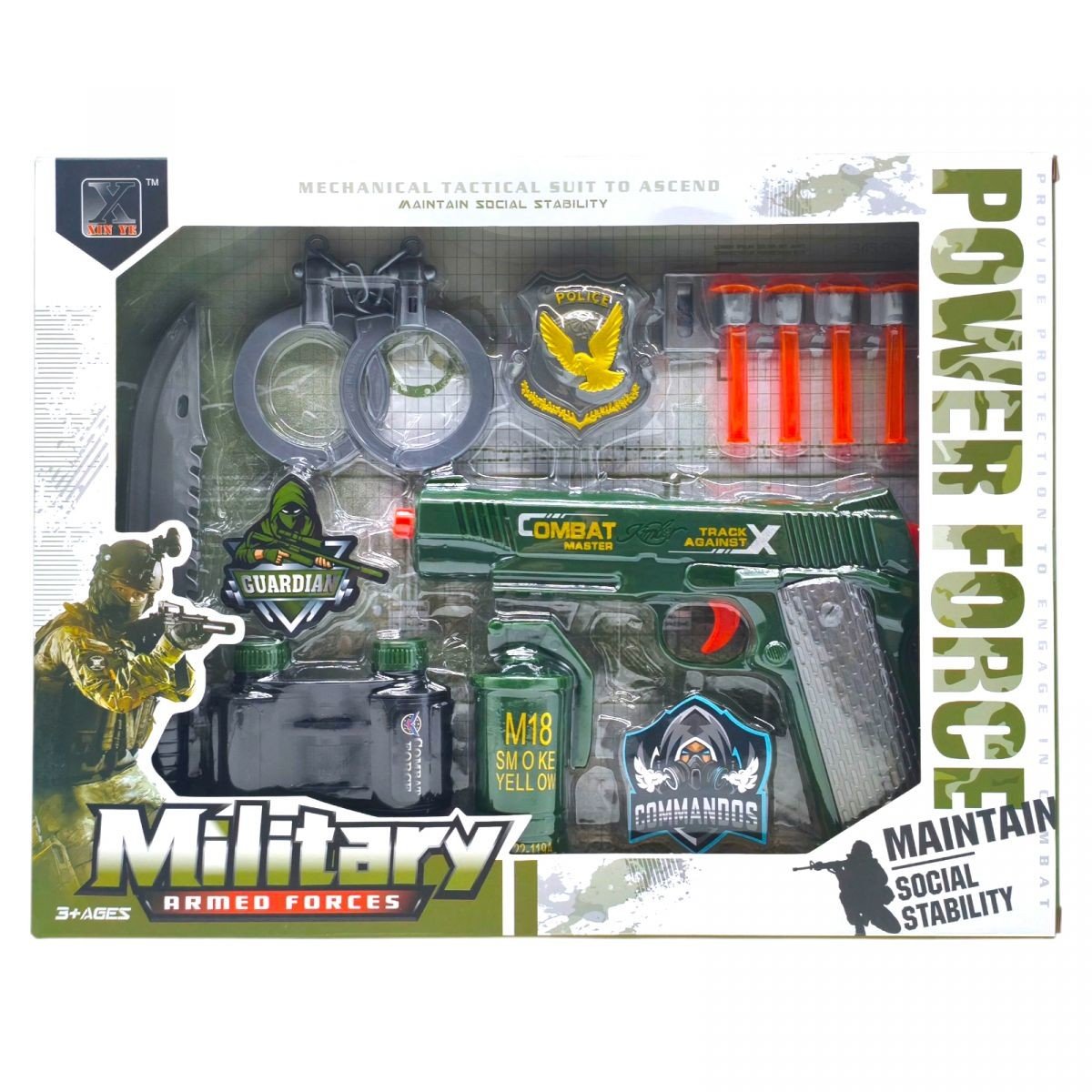 Цей набір ідеально підходить для розширення рольових ігор, повʼязаних з військовими діями. Він включає пістолет з липкими патронами і ніж, а також наручники і бінокль, що забезпечить незабутні враження. Набір виконаний із міцного пластику. Призначений для дітей віком від 3-х років.
