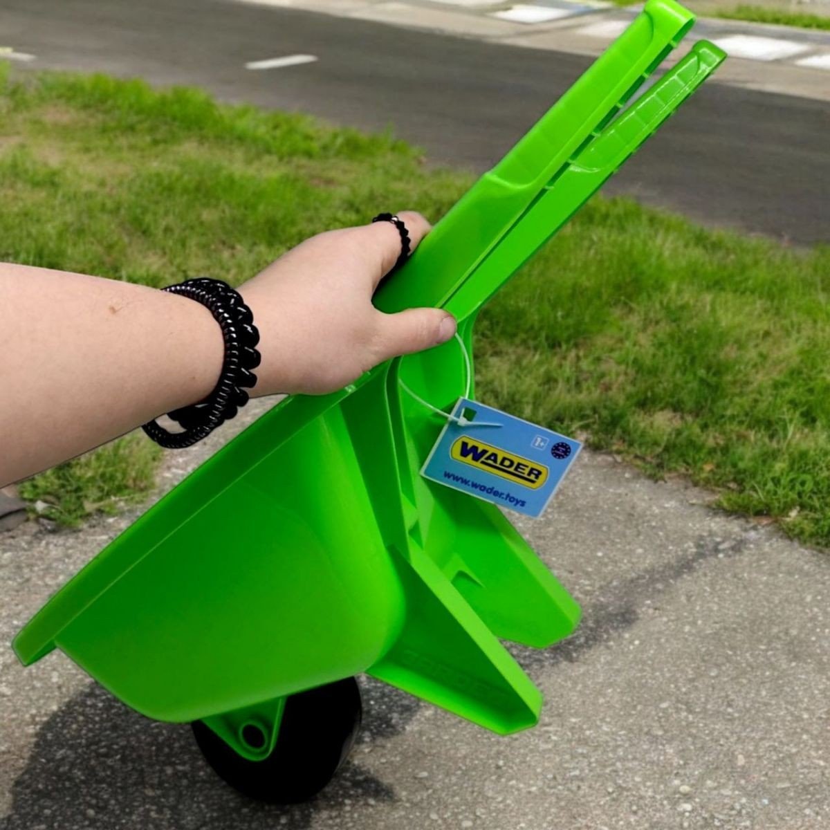 Дитяча тачка - чудове рішення для ігор на свіжому повітрі! Підходить для перевезення піску, іграшок та інших дрібниць. Виготовлена із міцного пластику, має зручні ручки та стійку конструкцію. Довжина виробу - 54 см, пластикове колесо діаметром 11 см забезпечує легкість пересування. Ідеальна для дачі, пляжу чи пісочниці.
