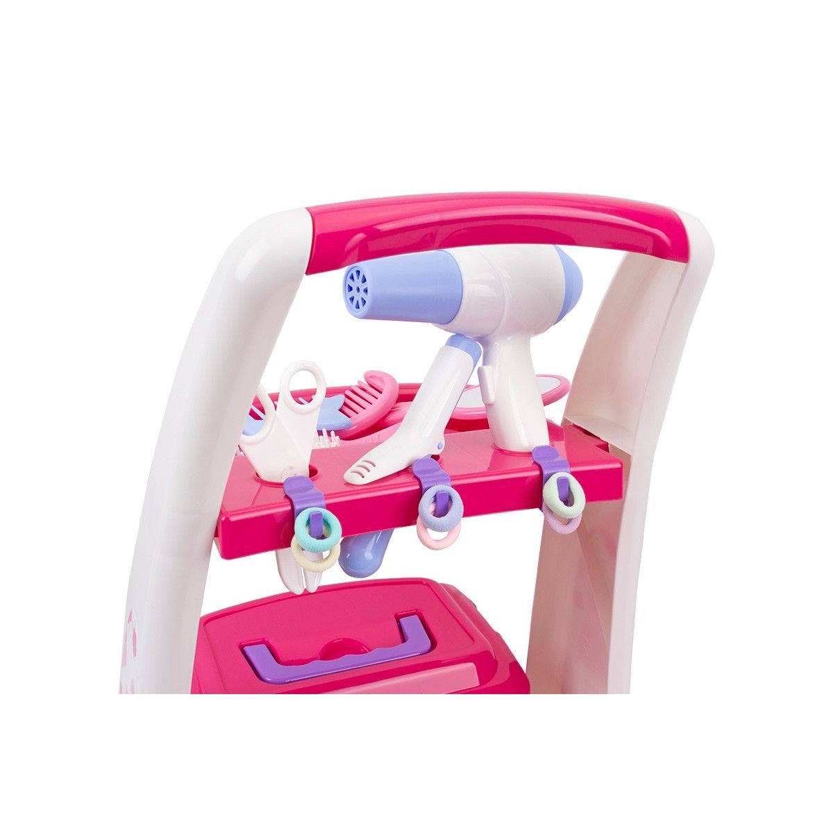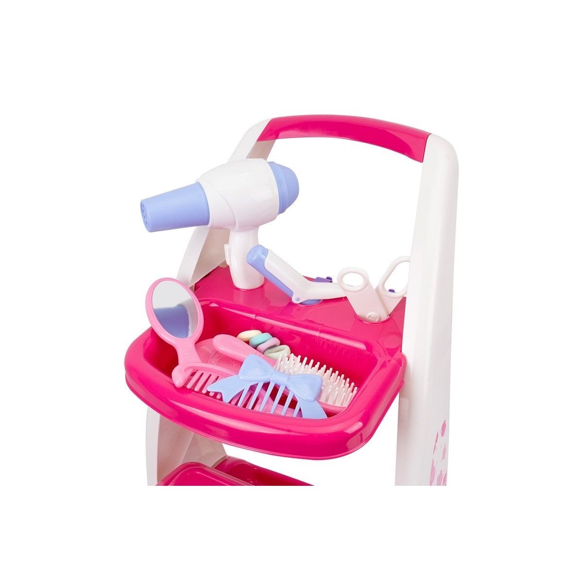 Набір оснащений валізою та зручним візком для переміщення своїх інструментів, забезпечуючи вам все необхідне для створення зачісок для подружок, мами або навіть вашої улюбленої ляльки. У наборі ви знайдете різноманітні професійні інструменти та аксесуари. Для зручності майстра-перукаря передбачений пояс із кишенями, щоб усі інструменти були доступні. А спеціальна накидка на клямці допоможе зберегти одяг клієнта чистим. Крім того, в комплекті включені гребінець, щітка, плойка та шпилька у формі бантика для створення модних зачісок. Дзеркальце з ручкою, пінцет та пудрениця завжди під рукою для ідеального макіяжу. А щоб ефективно висушити волосся та створити легке укладання, пропонується використовувати фен (імітація). Розмір візка – 54 х 39 х 37 см.