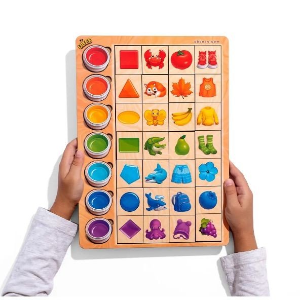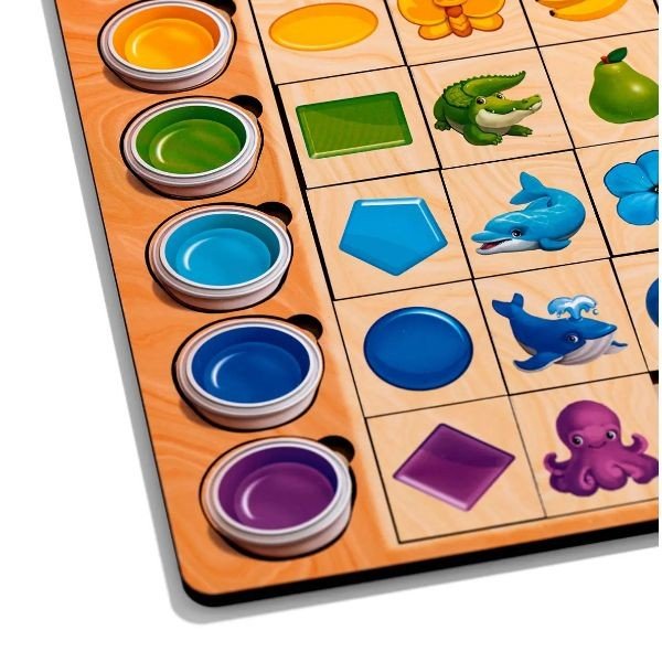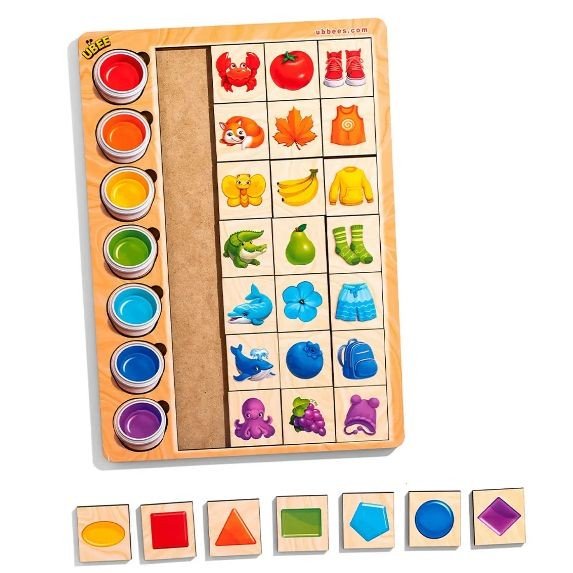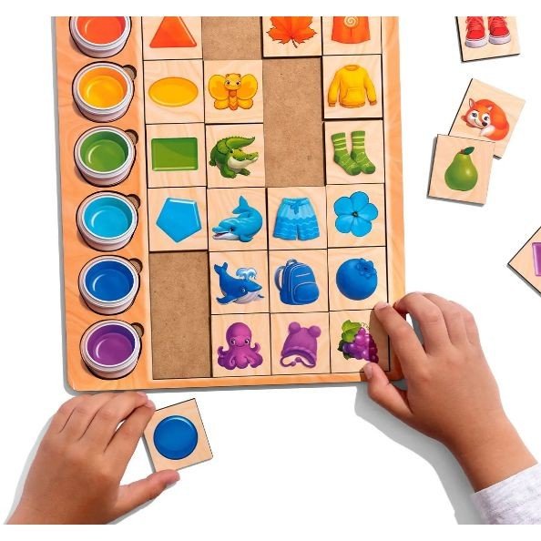 Набір вкладок з різноманітними кольорами, захоплива гра головна ціль якої завдяки асоціаціям розставити тваринок, їжу та предмети згідно з їх забарвлення. Екологічна іграшка, що допоможе в певних випадках виявити ознаки дальтонізму у дитини. У наборі присутні 30 різних деталей. Виготовлено з дерева. Рекомендовано для діток від 4 років.