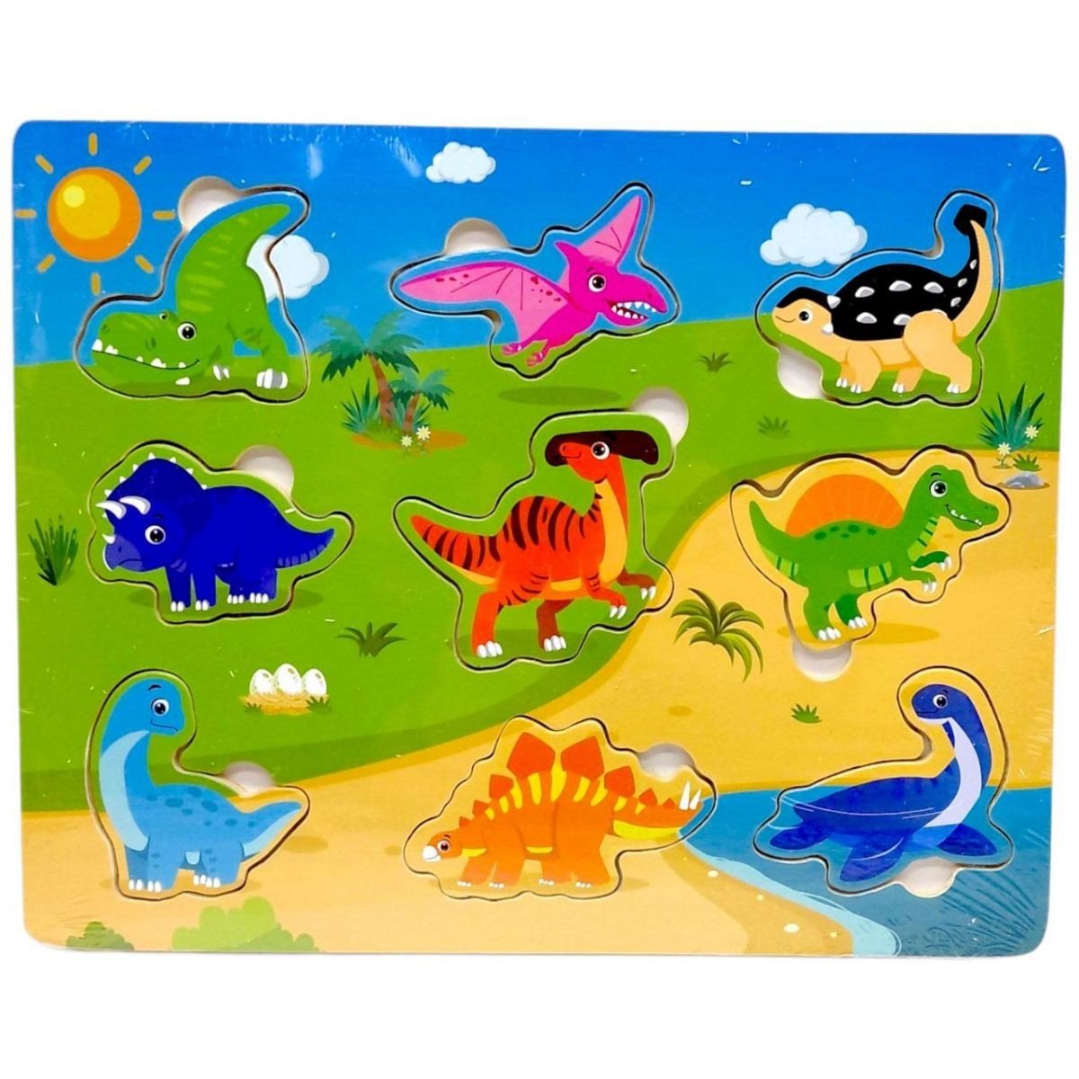 Дерев’яна рамка-вкладиш з тематикою «Динозаври» призначена для розвитку дрібної моторики, уваги та логічного мислення у дітей. На основі розміщені контури різних фігурок, у які необхідно правильно вставити відповідні елементи.