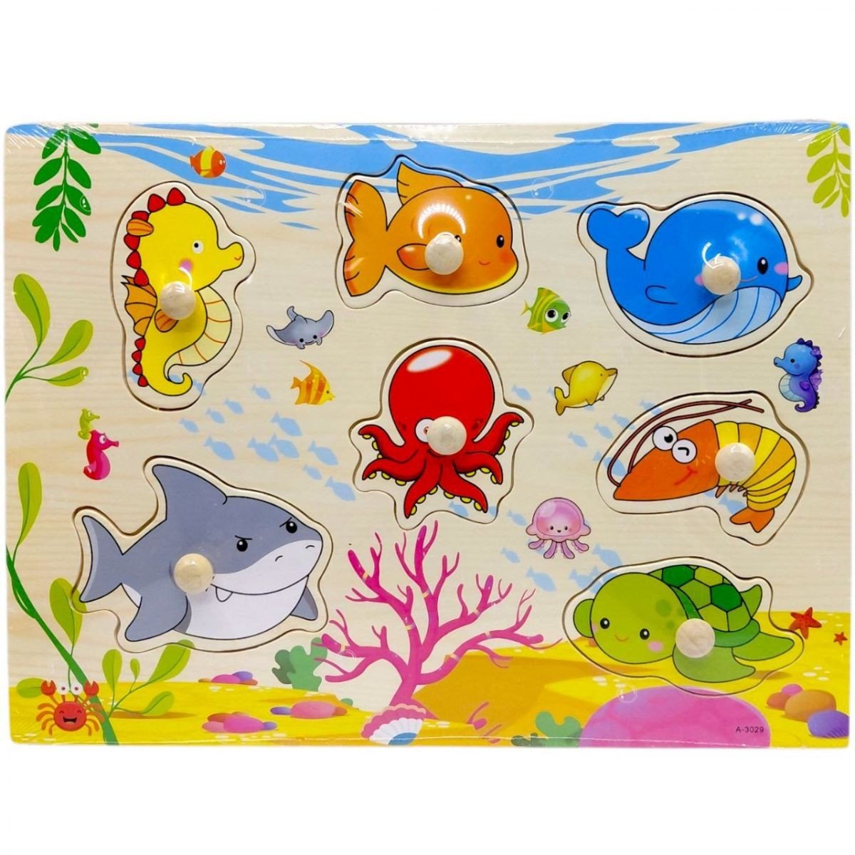Дерев’яна рамка-вкладиш з тематикою «Морські тварини» створена для розвитку моторики, мислення та зорового сприйняття у дітей. На основі зображена яскрава сюжетна сцена з різними видами фігурок, а кожен елемент потрібно правильно вставити у відповідний отвір.