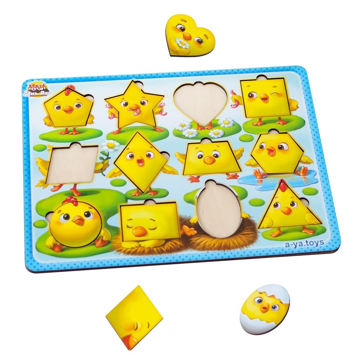 Яскрава та цікава гра. Маленькі курчатка - це 12 вкладишів різної форми, які малюку необхідно вставити на свої місця. Усі деталі легко діставати пальчиками. Під час гри дитина вивчить назви геометричних фігур, порахувати від 1 до 12.