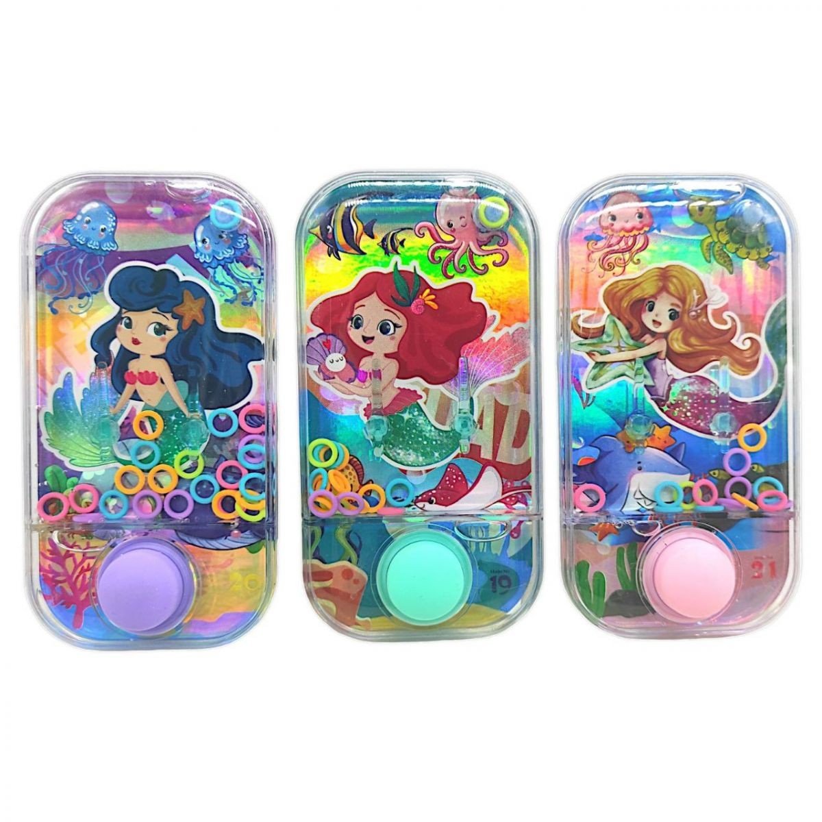 Гра в кільця з яскравим малюнком на задній панелі. Стильний, привабливий дизайн. Усередині іграшки знаходиться вода, в якій плавають кільця. Суть гри: за допомогою кнопок необхідно закинути усі кільця на стовпчики. Виконані із міцного пластику, кнопки гумові. Для дітей віком від 4-х років.