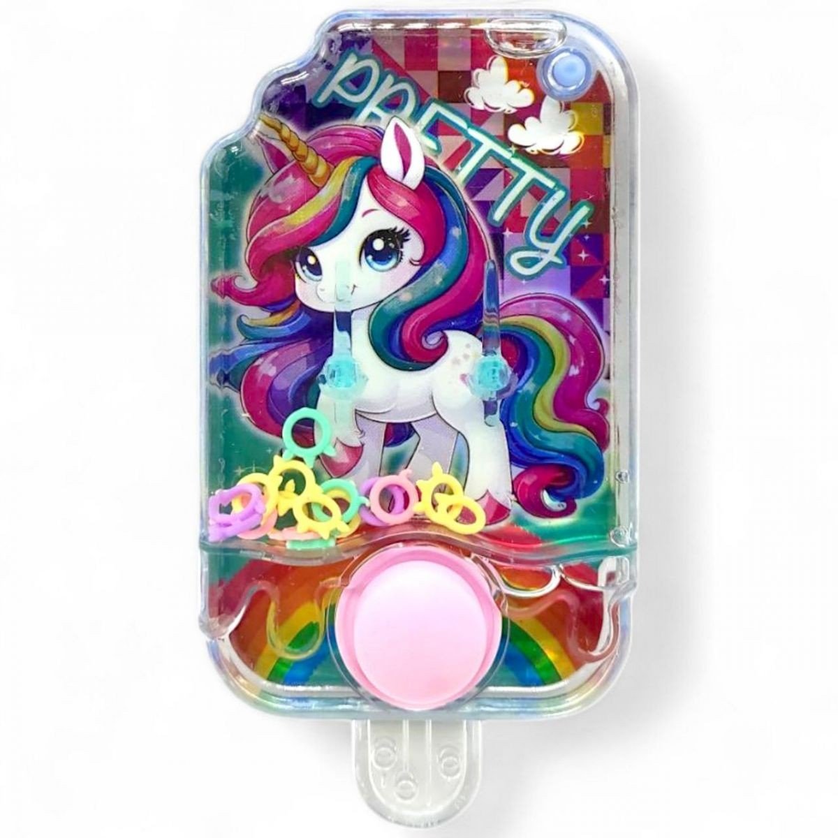 Водна гра в кільця (або з кульками) з яскравим малюнком на задній панелі. Стильний, привабливий дизайн. Усередині іграшки знаходиться вода, в якій плавають кільця/кульки. Суть гри: за допомогою кнопки необхідно закинути усі кільця на стовпчики/закинути кульки в жолобки. Виконані із міцного пластику, кнопка гумова.