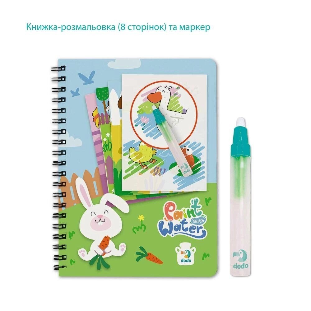 Водні розмальовки у формі блокнота на 8 сторінок. Щоб картинка проявилася, потрібно набрати воду в маркер, який є в наборі, та розфарбувати листок. На кожній картинці є приховані елементи, які дитина має знайти, проявивши малюнок. Кольори на картинці зникають, коли вода висихає, тому розмальовки можна використовувати по кілька разів. Виконано з якісних та безпечних матеріалів.
