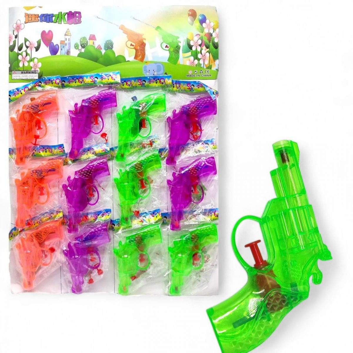 Бренд: MIC Упаковка: Планшет Колір: Різнобарв'я Ел-ти живлення в комплекті: Ні Вага з упаковкою: 28 г Габарити в упаковці: 2.5 x 39 x 53 см Матеріал: Пластик Комплектація: Водний пістолет 12 штук