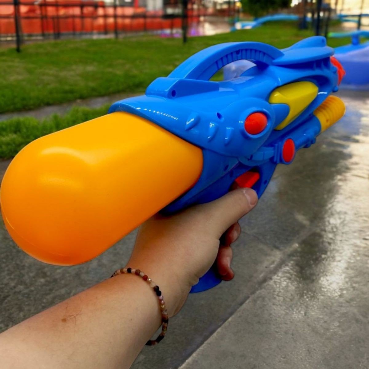Водна зброя з накачуванням - це іграшковий пістолет, призначений для стрільби струменем води. Для створення тиску та пострілу, у зброї передбачена система накачування. Треба вручну нагнітати повітря в резервуар, після чого вода випускається під тиском, створюючи потужний і далекобійний струмінь. Ця зброя ідеально підходить для активних ігор на свіжому повітрі та гарантує масу веселощів. Розмір - 39 см.