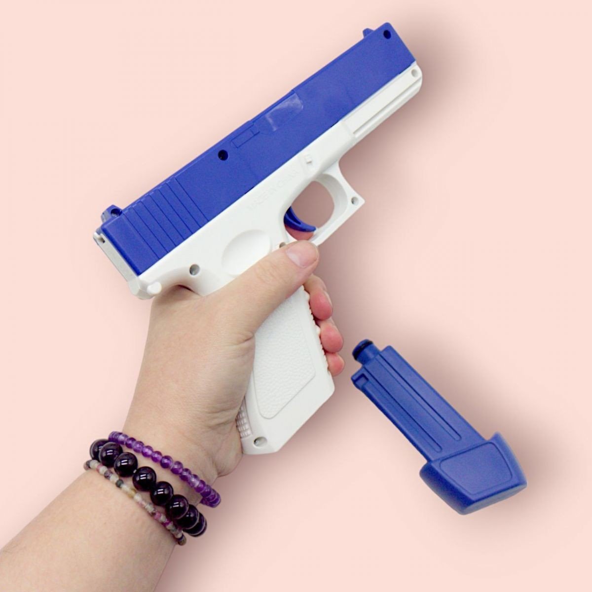 Водний пістолет, який стріляє одним суцільним струменем води (приблизно на 6 м.). Вода наливається в магазин, який потім кріпиться до пістолета. Іграшка невеликого розміру (16х22х3 см.), виконана у лаконічному дизайні. Працює від 2 батарейок АА (немає в комплекті). Рекомендовано для дітей старше 3-х років.