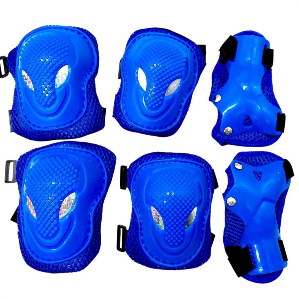 Опис Захисний набір: налокітники, наколінники, запʼястя, у сітці (СИНІЙ)